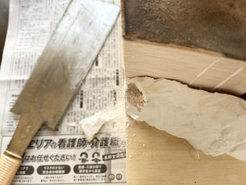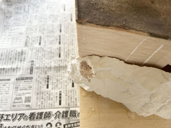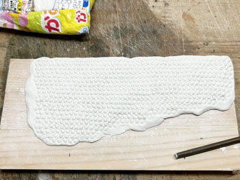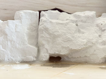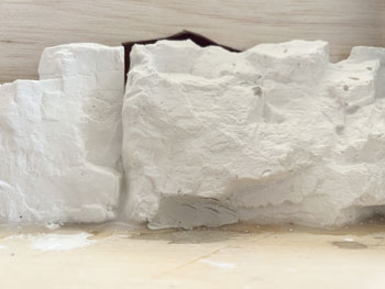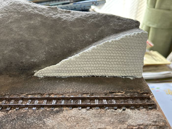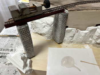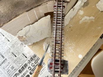 ![]() 裏山の右端に設置した山への小径の石積みを作っておきます。 素材は例によって例の如しなのですが、紙ねんどを板の上に指で伸ばして、自作のパイプを潰した工具で型押ししていきます。 ![]() 出来上がった小径の石積みを当該箇所に木工ボンドで接着して、余分な部分をもぎ取るようにカット。 ![]() ![]() 岩壁を固定したエポキシ系接着剤も完全に固まったようでしたので、ここで岩壁の加工をすることに方針転換。 台枠の外に飛び出した部分はノコギリで切っておき、橋脚と干渉する部分も引き回しノコで切り取っておきました。 そして橋脚をエポキシ系接着剤で固定。 さっき切り取った岩壁はふと浮かんだアイデアで対岸の岩場に再利用することに決定(^^♪。 これもエポキシ系接着剤で固定しましたが、いずれこれも飛び出た部分はノコギリで切り落とします。 ![]() ついでに岩壁の下の隙間を紙粘土で埋めておきました。 いずれレジンを流して川を表現する場合には僅かな隙間からでも流失してしまいますので。 ![]() こうなったら岩壁作業の続行で、ここの石積みも作ってしまいました(^_-)。 大きな方は時間との闘い(^O^)でした。 ただでさえ単調な作業で肩が凝ってくるのに、2/3ほど終えたところで明らかに紙ねんどが硬化しつつあるのを指先が感知(@_@)。 そこからは一気呵成に型押しを進めて、もう半乾きになってるものを所定の長さにカットして貼り付けました(^_-)-☆。 こんな作業をしている間に小径の石積みも完全に固着したようですので、とりあえず裏山の草撒きを開始します(^^♪。 |