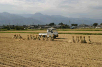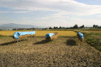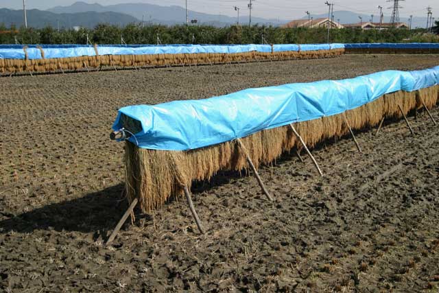 左の写真は、まだシートを被せていない状態で、稲の掛け具合がよく判ります。適当に束ねた稲は「藁ぼっち」と呼ばれ、これから「はざ掛け」にされるものです。乾燥させた稲は、脱穀機に掛けて「米」と「藁(わら)」と「もみ殻」とに分類します。