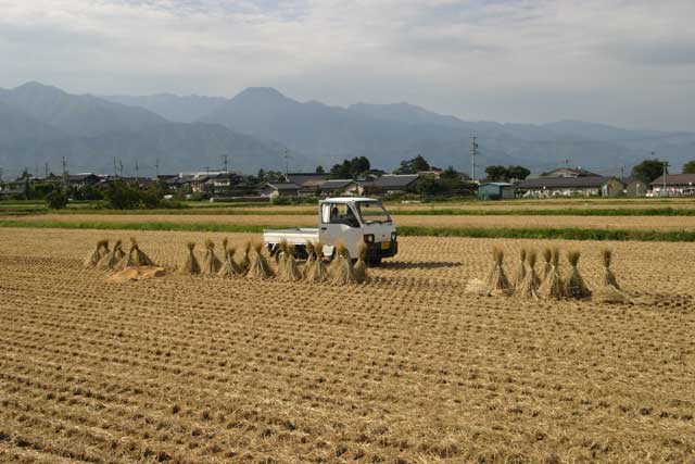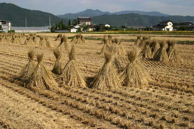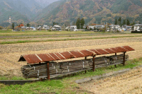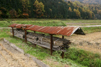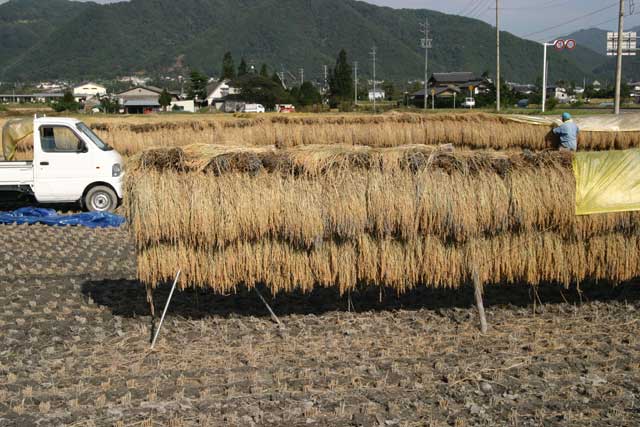 いったい「はざ掛け」とはどんなものなのでしょうか?田圃の片隅にトタン屋根で覆った、長い丸太が置かれているのを見たことがありませんか?あれが「はざ掛け」用の脚です。その丸太をハの字に組んだものをいくつか用意して、更にその上に丸太を載せて出来上がります。刈り入れた稲をその丸太に掛けていき、最後に雨露を忍ぶためのビニールシートを被せます。