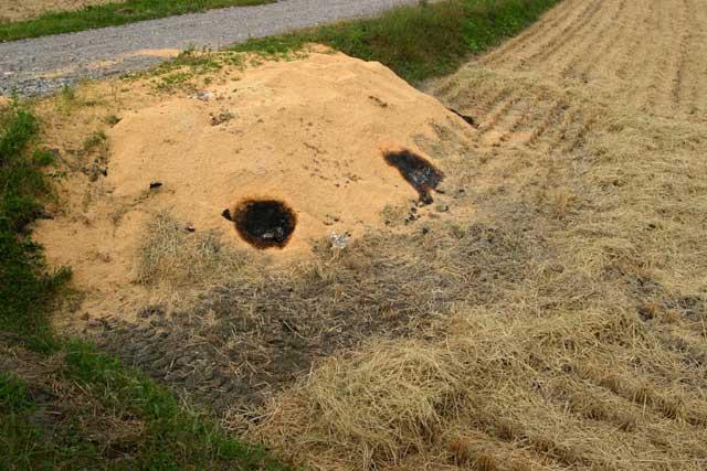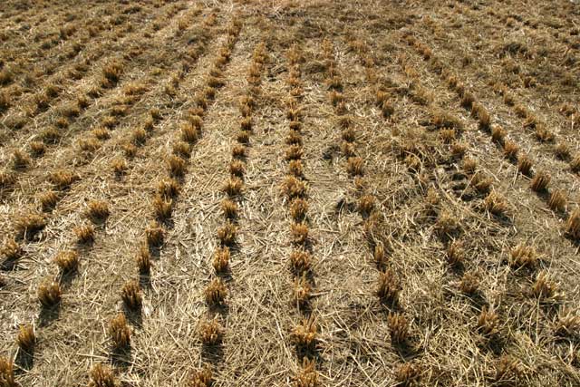 もみ殻は、写真のように燃やして(ちょうどお灸のようにくすぶり続けます)肥料にします。刈り入れが済んだ田圃には、細かい藁が一杯散らかっているのが判るでしょうか。