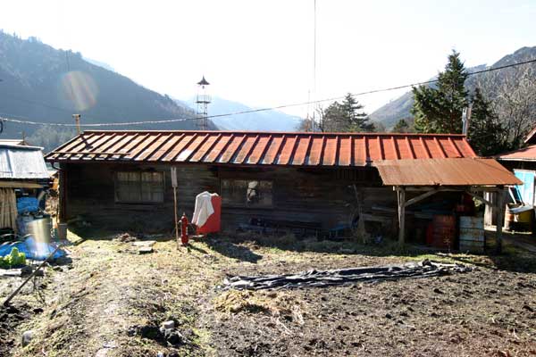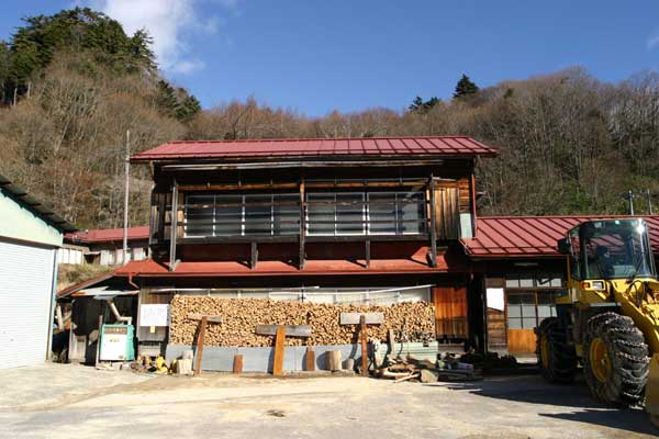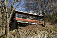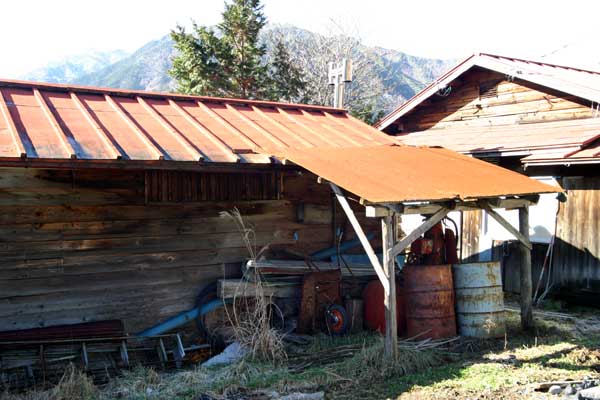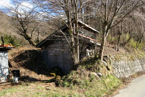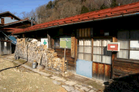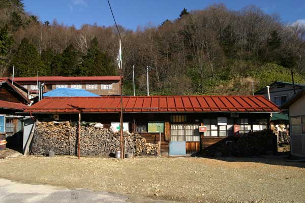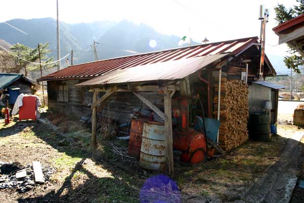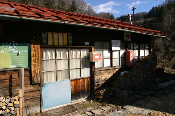現在は林道事業所の詰所として使われており、軒下に高く積まれた薪が「生きている証拠」です。冬ともなれば深い雪に閉ざされてしまう土地柄ですが、案外屋根の勾配はありません。殆ど松電の詰所と変わらない程度です。但し、雪止めはちゃんと付いています。もうひとつ特筆するべき点は、瓦はめったに使われないということです。これは民家でも同じで、まず瓦葺きの屋根を見掛けることはありません。裏側に廻ってみると、ガソリン計量器をそのまま使った燃料タンクが差し掛けの下にありました。暖房用と風呂釜用とで、薪と灯油を使い分けているようです。