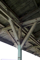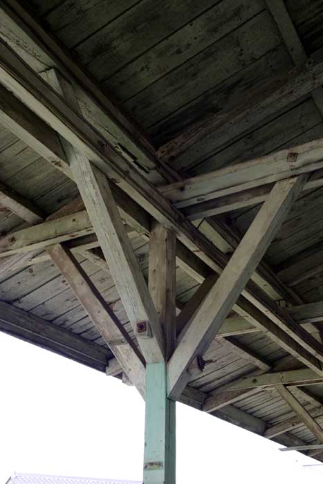 巧みに組まれた柱のディテール。そこからは駅名標が吊るされています。