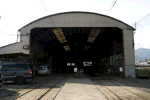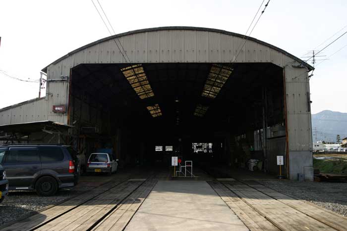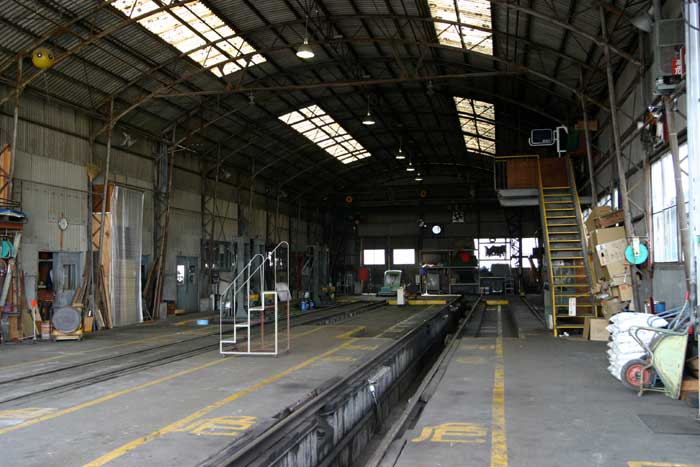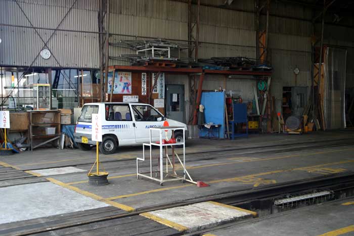 それでは中を拝見しましょう。ピットのある2線式で、この時は車輛が入っていなかったので、結構広く感じました。パンタグラフは棚の上。他の電鉄でも同じように棚に乗せられたパンタをよく見ましたので、これはひとつのルールなのかも知れませんネ。