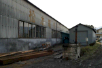 その裏手に控えるのが車輛修繕庫です。カマボコ形で造りは簡素で、波板を貼り付けた構造になっています。周りを見ていくと、裏側の田圃面には松本電鉄の文字が大きく書かれています。その反対の線路側には旋盤などを備えた工作所が張り出しています。