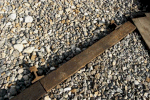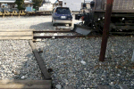 倉の前から構内を見渡したところ。本線はだいぶん架線柱の鋼製化が進んでいますが、構内はまだ木製のままです。渡り板も随所に設けられています。足元をよく見ると、古レールで土止めを押さえていました。こんなところも模型で再現するとイイかも知れませんネ。