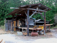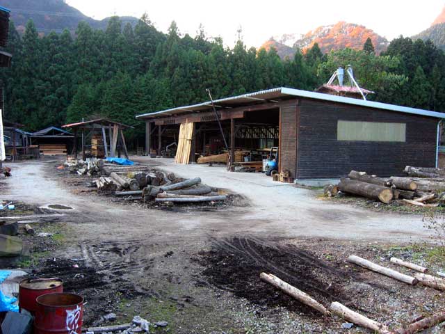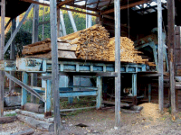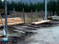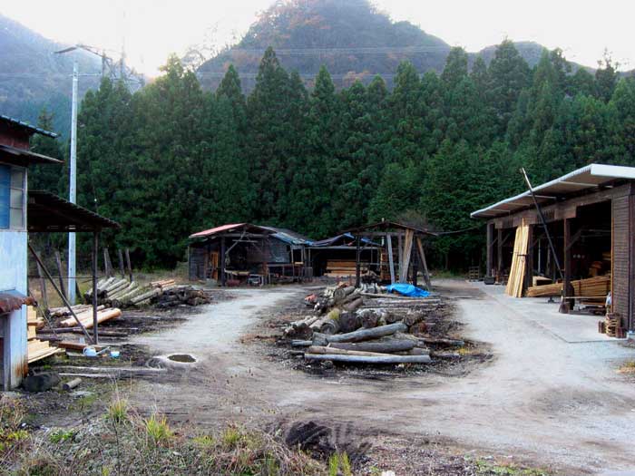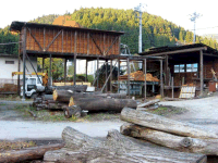 右手前には角材に加工する機械があって、トラックが横付けされていました。