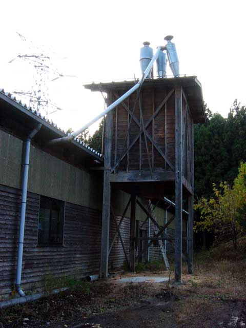 加工場で発生したおが屑は一旦吸い上げられて、屋外の貯蔵タンクに納められます。その下にはトラックが入れるようになっています。トラックに載せる時に風で飛んだのでしょうか、辺りにはおが屑が散乱していました。また、国道を挟んだ倉庫には、様々なサイズの角材が保管されていました。