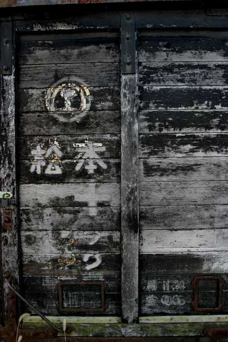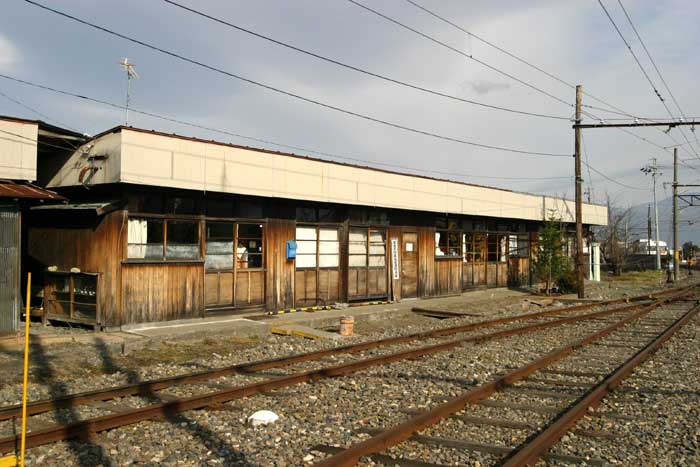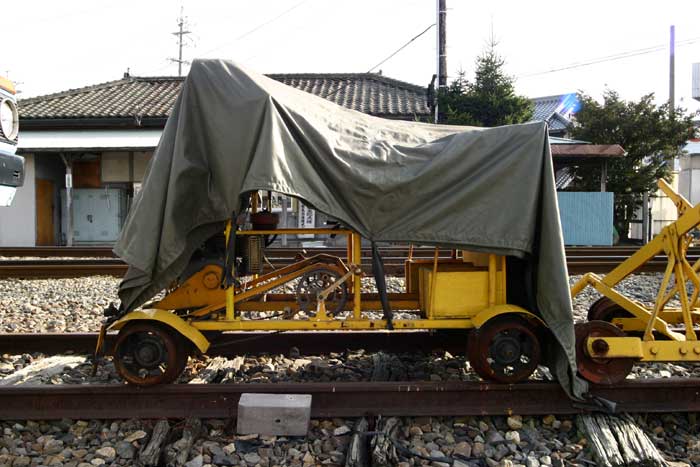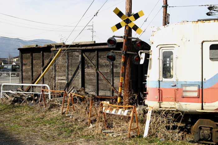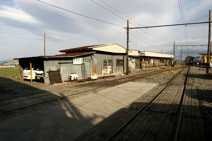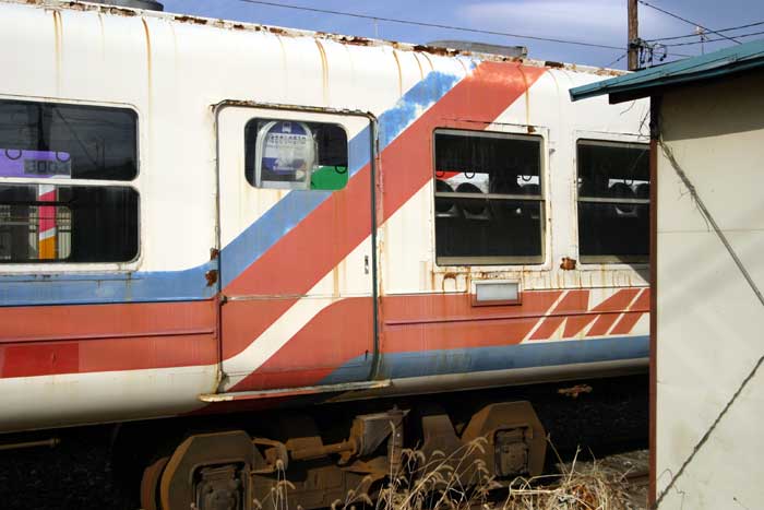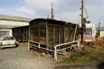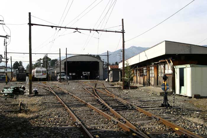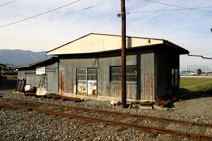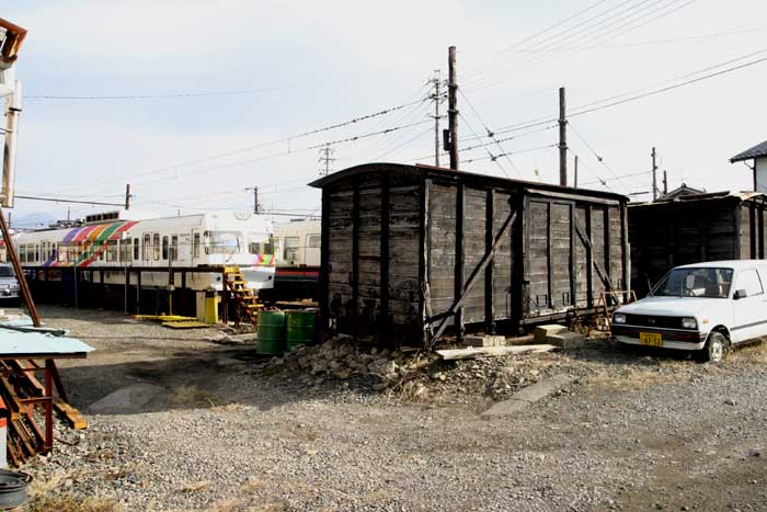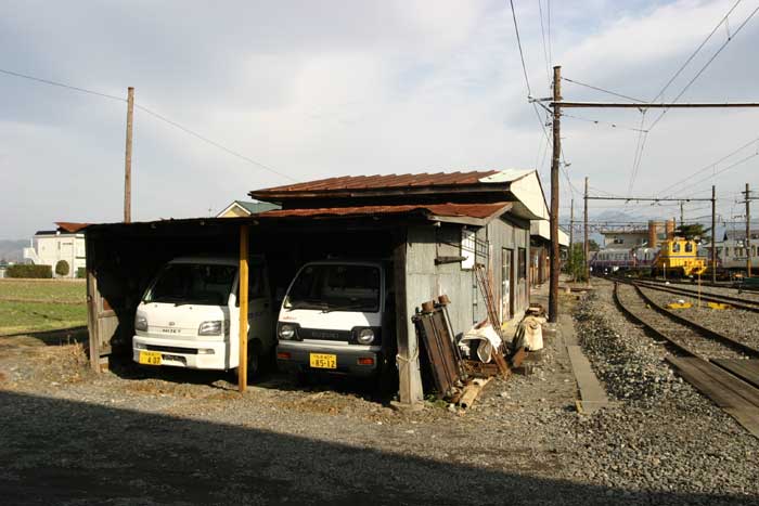 車輛区といえばお決まりが廃車体です。大概は創業当初からの古い木造有蓋貨車が、物置に使われていたりするものですが、ここ松電では貴重な5000系までもが、バス停標識の置き場になっていました。