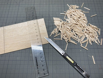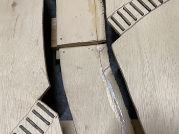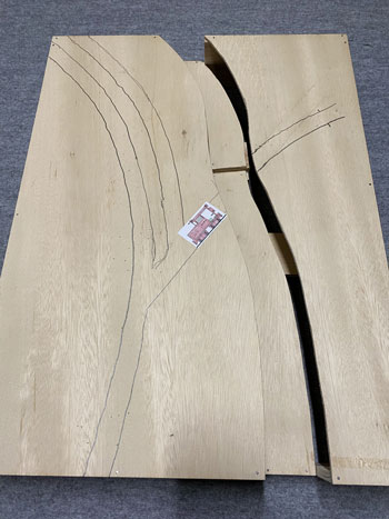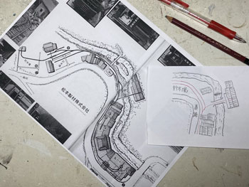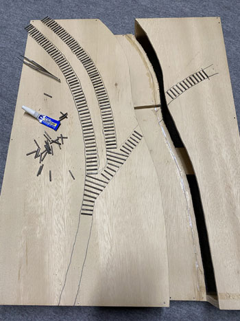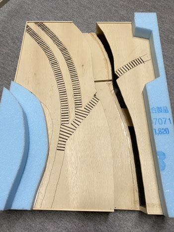 ![]() このイメージを作るに先立って、写真から「こんな感じかな?」と青森さんに送ったのが左の絵。 そうしたら「大昔にレールマガジンに掲載した見取図があるから」と送って下さり、より具体的にイメージを掴むことが出来ました。 ![]() 早速ホームセンターに行って4mm厚のベニヤ板と角材を購入して、台枠を組み始めました。 渓流部分は引き回しノコで切って、切り出した部分は川底として再利用します。 ![]() 実際にはマイクロエンジニアリング社の#40の引き抜きレールを使いますが、PECO製のフレキシブルレールを仮に置いてみて大体の感じを掴みます。 貯木場の線路間隔やポイントの位置などを確認して、右に10mmとか奥に10mmとか微妙に位置を換えながらイメージするベストな位置を求め、これで良いと思ったところで鉛筆で印をつけています。 ![]() ![]() 2mm厚バルサ材から枕木を切り出して、黒染めしておきました。いつもと同じ幅2mmで長さ20mmです。 枕木の間隔は「こんな感じかな?」と敷いていったのですが、結果的に後で測ったら8mm間隔でした。 手前の部分は材木置き場なのでコンクリート敷きです。 ![]() 枕木を接着したら橋脚となる部分の板をカットしておき、4辺には地面に土を撒いたときの土留めとして3mm角材を接着しておきます。 ![]() ここで台枠に道路の位置を書き込み、それに従って道路と傾斜地の土台をウレタンフォームで作って接着。 これが乾くのには時間が掛かるので暫くは放置プレイだな、と思って眺めていたら、妙な事に気づいた訳であり。 コンクリート敷きの部分にも枕木を接着しておかないと引き抜きレールを固定できない(@_@)。 以前、コンクリート敷きを再現した立山砂防のレイアウトVのように、紙粘土を使おうと考えていたのですが、これはウッカリでした(^O^)。 ということで、この部分にも枕木を接着しておきました(^^♪。 ![]() ![]() ウレタンフォームを貼った接着剤も加工できるほどに固まったようなので、道路を削って傾斜をつけて、道路脇と対岸の傾斜地も削ってやりました。 川辺に貼ったウレタンフォームは橋脚の部分をカットしておき、その後で斜めに削っていきます。 |