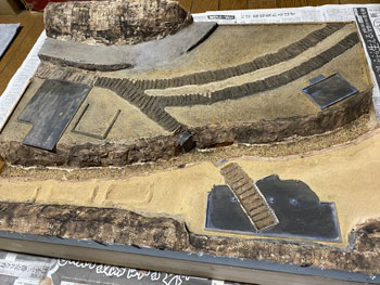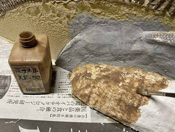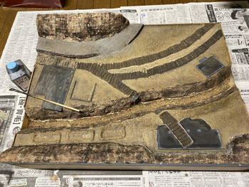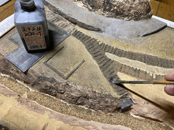 ![]() さて、地面の着色です。 コンクリートを打った建物の部分を除き、ありとあらゆる部分をフラットアースの溶液で塗っていきます。 ![]() 途中でこの溶液は残り僅かになってしまったので新しく作ってやったのですが、大きなシンナーのボトル1本に対して、フラットアースの瓶1本の割合で薄めておきます。 ここで肝心なのは、先を急いで濃いものを塗らないこと。 濃い塗料を塗ってしまうと全くニュアンスをつけることは出来ませんが、薄い塗料を塗り重ねることによってそれが可能になるからです。 また舗装をした道路の部分にもフラットアースを塗ることによって、クッキリと「ここからは舗装道路ですよ」と主張することもなくなり自然な感じになります。 土の部分との境目もファジーになります。 皆さんの作品を拝見するとこれが「クッキリ」になってる場合が多く、不自然な感じがしています。 自然界を見回すと、雨も降れば風も吹く。それによってクッキリとした境目がなくなっているものです。 ![]() これを充分に乾かしてから、次はフラットブラックの溶液で更にニュアンスをつけていきます。 ![]() 左の写真の手前の方はフラットブラックでの未着色部分なので、その違いはお分かり頂けるでしょう。 右の写真はその作業を完了した状態で、手前の畑の土も砂漠から肥沃なものに変身しました(^^♪。 ![]() ![]() フラットブラックの溶液を5回、ニュアンスをつけながら塗っていき、場合によってはデザートイエローの溶液を使ったりして、ようやく満足のいくところまで仕上げた地面。 朝起きて見てみたら程よい感じに仕上がっていました(^^♪。 塗ってるときと塗料が乾いたときとは感じが違ってきますので、それを予想しながら仕上げていくのですが、これは何度やっても難しいです。 そこで出来上がっている建物や橋を置いてみて、全体の色調などをチェック。 まあ、こんなもんでしょう(^O^)。 |