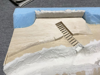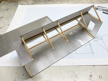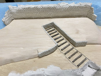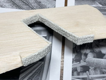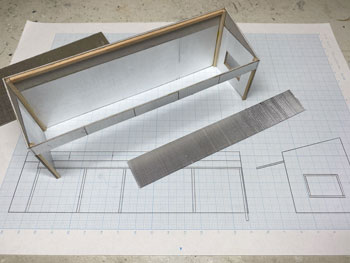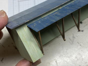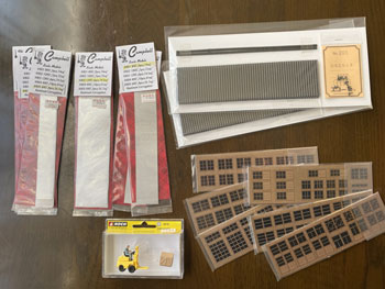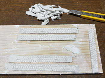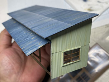 ![]() ![]() 次は対岸の製材所を作るのですが、青森さんが撮影された写真を見ると、ここは建物の中に線路が入り込んでいて、しかも建物の地盤がプラットフォームのように一段高くなっているのが特徴です。 つまり、荷の積み下ろしをしやすくしているのでしょう。 それを表現するために10mm厚のバルサ板を地盤型に糸ノコで切り、建物の柱がその位置に来るように型紙を作って採寸しておきました。 ![]() そのプラットフォームには石積みの縁石があるので、例によって紙粘土で作りました。 ついでに傾斜地の土留めの石積みも作っておき貼り付け(^_-)。 うん、悪くない雰囲気(*^^)v。 ![]() 昨夜のうちに下ごしらえをしておきました。 対岸の製材所はとにかくオープンな構造なので、側板や妻板・屋根板にできるだけ目立つ補強材を入れなくても良いように、ボール紙を板目の違う方向に2枚重ねに瞬間接着剤で張り合わせ、それ自体で反りが出ないようにしておきました。 ![]() そして全面にキャンベルの波板を貼り付けて箱状に組み上げ。 柱は1.5mm角の桧角材を使ったのですが、ヒサシの支柱は特徴のある斜めの柱を表現。 ここまできたところで塗装をしました。 ![]() 全体はタミヤのスカイを塗り、なぜか交互に色の違う幕板はライトブルーを使い、屋根はミディアムブルーとしてみました。 本物の色はどういう色だったのか分かりませんが、レイアウト上で手前側には重厚な色合いの二階建を配置したので、こちら側は軽快な色合いにしたかったのが理由です。 柱は例によって薄く溶いたフラットブラックで染めておきました。 塗料が充分に乾いたところで、ハンブロールの63番でサビが浮いた感じに仕上げて完了(^^♪。 今回はエコーモデルのレーザーカットされた窓枠を使ってみました(^_-)。 さて、これでこの製材所は出来上がったので、瓦屋根も届いたことだし、まだ二階建の材木置き場を仕上げてしまいましょう(^_-)-☆。 |