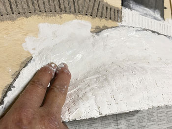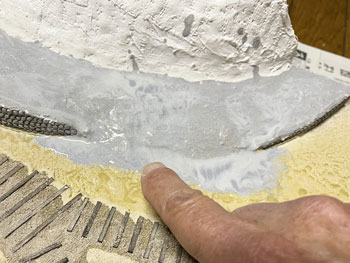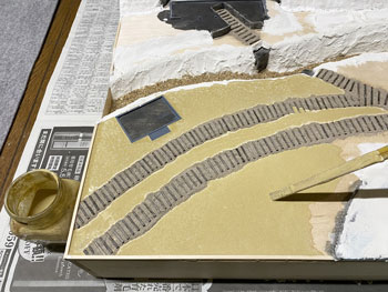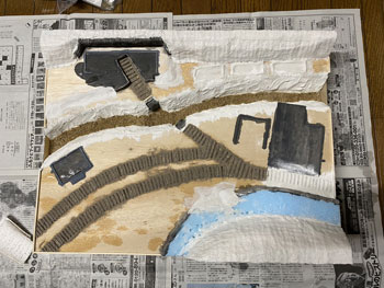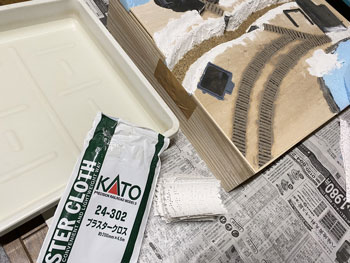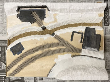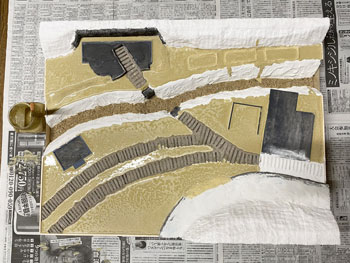 ![]() 傾斜地をプラスターでコーティングしました。使う材料は毎度お馴染みのプラスタークロス。 5cm四方ぐらいに切って使いやすくしておき、むかし暗室作業をしていた時に使っていたバットに水を入れて、これに浸しながら天ぷらの要領で貼り付けていきます。 1枚貼っただけでは下地が透けて見えますから、3回ほど繰り返してそこそこの厚みを持たせます。 ![]() 道路は舗装したようにしたかったので、紙粘土を擦り付けておきました。 ![]() ライトサンド色のテクスチャーペイントをアクリル系シンナーで若干薄め、割りばしを使いながら流し込み。多少はみ出していても全く気にしません。 むしろ定規で引いたようにキッチリしている方が不自然ですから(^O^)。 ![]() ![]() ライトサンド色のテクスチャーペイントが乾くのを待つ間に、紙粘土でコーティングしておいた道路にもライトグレーのテクスチャーペイントを撒きました。 土との境目は指先で曖昧にして自然な感じにしておきます(^^♪。 |