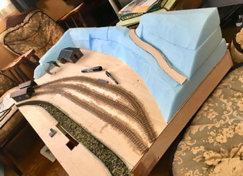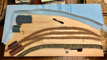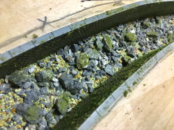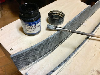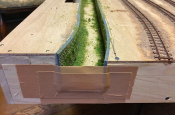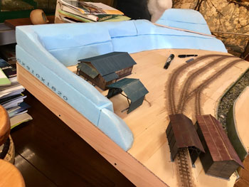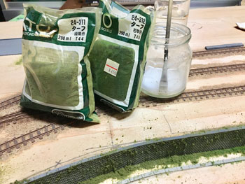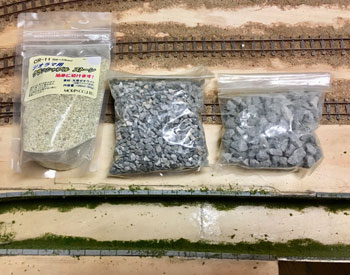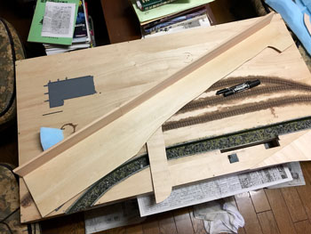 ![]() 予定していた建物が総て出来上がったので、そろそろ川と山の工作に移ります。 この川は今では改良工事がされたのか、幅が広くて深くなりましたが、当時は狭くて浅い川でした。大体、駅舎の奥行もない幅だったのですから、推して知るべしです。 とはいえ簡単な護岸工事はされていましたので、Nゲージの石垣を使って表現してみました。 線路のバラストもそうですが、こういった物は意外とオーバースケールな物が多いので、チョット小さ目かな?とは思いますが許容範囲内です。 ここではグリーンマックスの製品を使い、所定の寸法に切ったものを瞬間で止めていき、エナメル系黒を薄く溶いたものでザッと塗って、乾いたところでシンナーで拭って、凹んだ部分だけに塗料が残るようにしました。 こうする事によって陰影がつき立体的になります。 ![]() 次に水で薄く溶いた木工ボンドを塗ってからターフを振り掛けて、乾燥しかけた頃合いを見計らって指でしごいて落とします。 つまりコケを表現したかった訳です(^_-)。そろそろ川に水を流し込む準備として、ガムテープを貼っておきます。 ![]() 次に川底の砂利を撒きますが、写真のように大小さまざまなものが売られていますので、これを利用します。 これは少し濃いめに溶いた木工ボンドで固定して、大きな岩にはターフを付けてコケっぽくしてみました(^^♪。 これが乾けば水を流し込む準備はOKです(^_-)-☆。 ![]() さて、山の製作に取り掛かります。山と云っても当然、山の斜面のそのまた極く一部ですが、とかくスケールが混乱してしまいがちなもの。 この点は非常に大事なので頭に叩き込んでおかなければおかしな物になってしまいます。HOスケールの自動車でも1台用意しておくと、スケールが混乱してしまわないでしょう。 使用したのは40mm厚のウレタンフォームで、発泡スチロールほど粒が飛散せず、加工しやすいので愛用しています。 まず大まかな形をマジックで描き、それに従ってカッターで切っていきます。 盆地のような立地条件は表現したいので、2段重ねにして高さを稼ぎ、部分的には3段にしています。 ![]() ザックザックという感じでカッターで切っていき(実はこの段階で勢い余って左の小指を切ってしまい、病院で6針も縫って貰いました・・・)、山道は平面性を確保するため、3mm厚のバルサ材で別途作っておきました。 これで大体の山の基本形は出来た感じです。 ![]() 山側から水平に撮影もしたいので、この山は取り外し可能にするため「山ベース」という感じの板を作りました。 4mm厚ベニヤと9x40の桧角棒を組み合わせたものですが、この上に山が乗る形になり、レイアウトパネルには木ネジで止めます。 ![]() 中央部で山ベースが浮き上がってしまうとみっともないので、浮き止め防止のフックも2か所作り、左右にも4mm厚板を山の形に切ってベースに貼り付けておきました。 そのあとウレタンフォームを木工ボンドで接着する訳ですが、これの乾燥が毎回実に遅いので、その間に川に水を流し込む事にします。 |