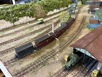 ![]() ![]() 「安全スローガン塔」とでも云いましょうか、司令塔の横とウグイ川線に行くトンネルの入口(というか出口というか)に建ってる三角柱をしたものです。 三角柱なんてどうやって作ろうかと考えて、松本製材の情景のときに買い込んだΦ8のバルサ棒から切り出す方法を考え出しました。 ザックリとカッターで削いでいき、粗目のサンドペーパーの上で注意深く正三角形になるように仕上げて、天辺を三角形に尖らせて。 ![]() ![]() ここからはパソコンの恩恵100%で、良い時代に生きてることに感謝。 スローガンのフレーズは様々な写真に写り込んでるものから打ち込みましたが、上下の寸法が殆ど同じになるように文字の大きさを変えたりしながら2回目のプリントで合格(^_-)-☆。 全体の高さがどうなるか分からないので少し長めに作っておいた三角柱ですが、これで天辺の三角部分を除いて42mmに決めてカットして、土に差す部分としてΦ1.5棒を打ち込んで接着。 天辺部分を赤く塗っておき、乾いてから木工ボンドでスローガンを貼りつけました。 ![]() ![]() 大鹿らしい光景は「司令塔」の他に「番線表示」があることでしょう。この黄色い札がケーブルにぶる下がっていて、「大鹿ヤード」らしさを出しています。 さて「番線表示の支柱」です。 色々と考えたのですが、最低限にして充分な効果がある方法を選び、正三角形の板とアングル材を組み合わせることにしました。 まず、t0.4の真鍮版を4枚貼り重ねて半田付けをして、正三角形の高さを7mm、6mm、5mm、4mmにケガいていき、それぞれ1.4を掛けた数値を底辺にしてケガキ。 それを糸ノコで切り抜いてから暖めて4枚をバラバラに。更に各々2枚の高さを6.5mm、5.5mm、4.5mm、3.5mmにヤスっていきました。 そこに1.0x1.0mmのアングルを半田付け。結果的には正三角形はこんなに必要なかった訳ですが、ま、保険ということで(^O^)。 最後に天辺の板にテスリ状のものをΦ0.3で作って、そこに「集材セット」に入っている滑車を半田付け。 ![]() MWプライマーで下塗りをしてから銀色に塗り、ウェザリングマスターで少し錆が浮いた感じに(^-^)。 そして地面に固定しました。 ![]() 一方、「番線表示板」はパソコンで数種類大きさを打ち出して現場に持っていき、どの大きさのが良いかを検討し、いつもロープ掛けに使っている絹糸を張って瞬間接着剤で固定。 そこに「番線表示板」を貼り付け記念撮影(^^♪。ここまで来ると、完成まで秒読み段階になります(*^^)v。 |