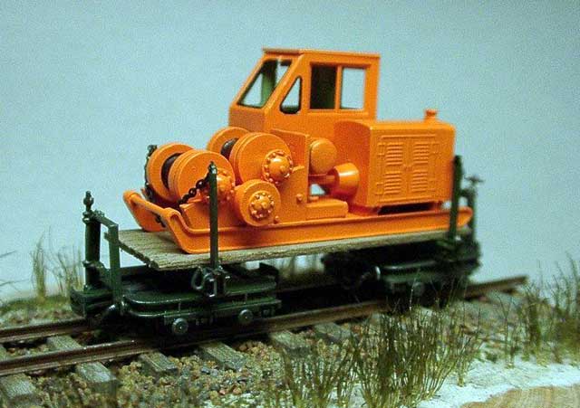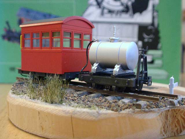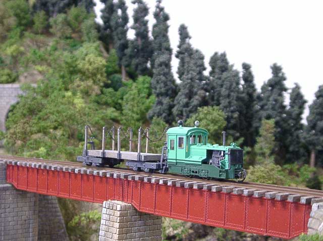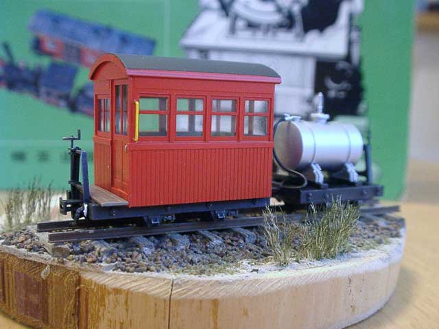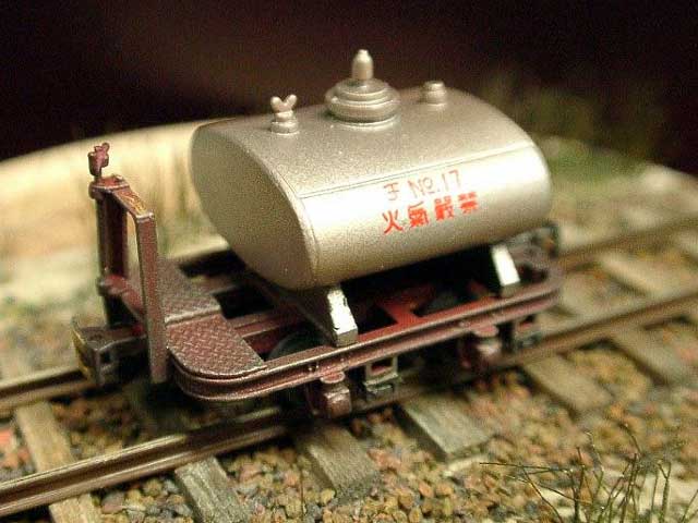 2003/08/05 もりこー様 前略 珊瑚祭のモジュール製作過程、楽しみに拝見させて頂いております。 さて遅ればせながら、楕円タンク車と集材機が塗り終わりましたので、写真を送ります。 楕円タンク車のインレタ、曲面に貼るのは難しいですね。この車両の塗装は、タンクが銀で下回りがダルレッドですが、かなりウェザリングを施しました。黒+ダークアースを中心に吹きつけてから銀でドライブラシ。床板の滑り止めの表現が強調されてかっこいい! 集材機は単体を購入しましたが、やっぱり運材台車に乗せたくなりました。台車をグリーンに、集材機をオレンジに塗ってみたら、メリハリがでました。 次は何を組み立てようかな? もりこー:確かにドライブラシしたタンク車のデッキがイイ感じ。集材機は実物のネズミ色にとらわれずに、自由な発想で仕上げられるのも楽しいところですネ。