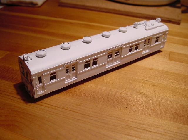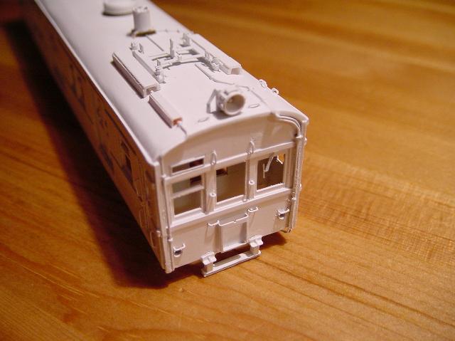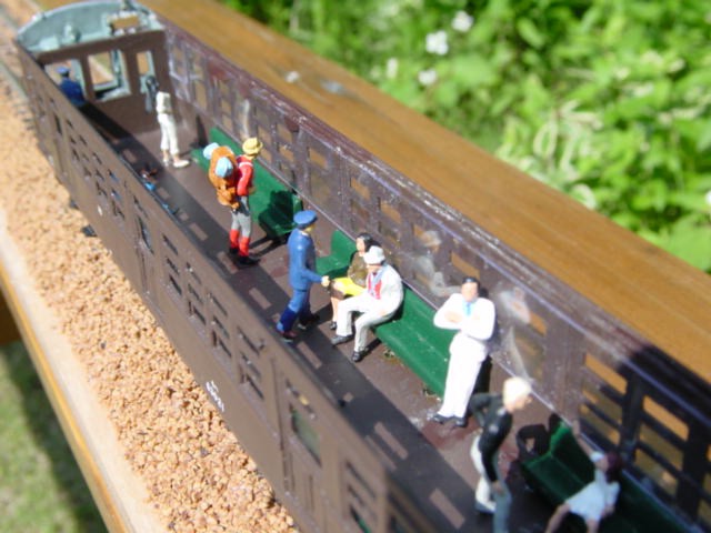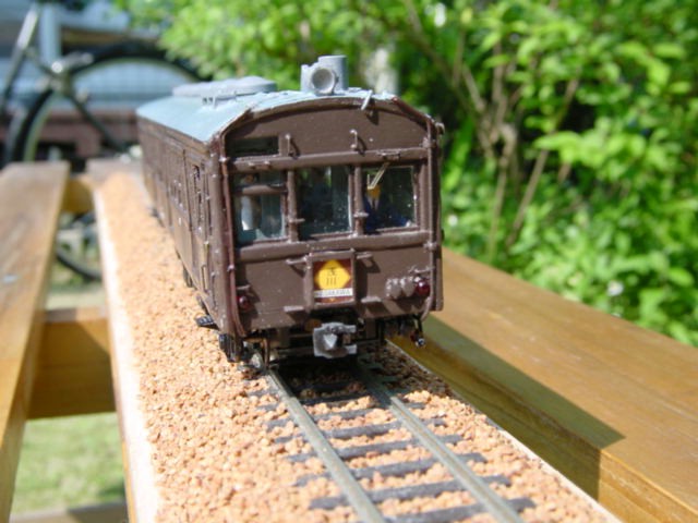 2001/06/19 ご無沙汰しております。早くも梅雨の入り、四季が風のように過ぎてゆきます。 いつぞやご報告したペーパークラフトの「クモニ13」ですが、梅雨入り前に塗装を済まそうとエアブラシを取り出しましたが、「待てよ、どうせ塗装するなら他にもやるか・・・」と思い立ち、「どうせお面は同じ」という単純な動機で「モハ63」を作りました。 電装品は、「クモニ13」には御社の松電WHのパンタをSP13に改造させていただいたものを乗せ、「モハ63」は電装前ということで歩み板までを装着、昭和20年代のイメージです。(本当はもう1台パンタを改造する時間がなかった)天井は、以前報告した「クモニ13」には御社のグロベンを使わせていただきましたが、既に売り切れとのことで、「モハ63」には1/80のグロベンの円柱を直径で1ミリ削り、リングを切断してこれも寸法をつめ、半田付けしたものを使用しました。床下は、「モハ63」にはたまたま入手した1/87モハ用を使用、「クモニ13」の床下は相変わらず裸です。 ここまで作って梅雨入り宣言直前、湿度50%の先週塗装、その後窓ガラス装着等に時間を費やした次第です。因みに方向板にはモハが「淺川(現在の高尾)」、クモニは「荷」を入れてみました。 塗装はモハが田宮のプラカラーのこげ茶、クモニが長谷川の省電色ですが、実感は田宮の方があります。天井のグレーはベンチレターと金属塗装色と塗り分けてみましたがお気づきでしょうか?また、モハは高尾山に向かう乗客のイメージでプライサーの人形を載せたので、天井を外れるようにしてみました。