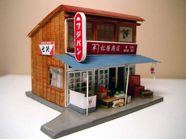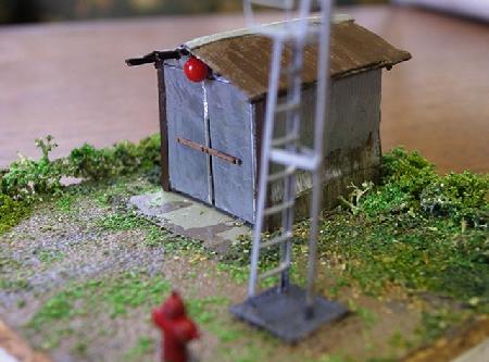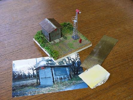 ![]() 2001/07/05 先日、高山の平田さんが当社に遊びに来られた時に持参されたのが、このジオラマ、消防小屋です。プロトタイプは、何と当社のすぐ近くのもので、以前遊びに来られた時にクルマを止めて、取材しておいたものだそうな。 赤い電球は定石通りマチ針を使い、火の見櫓は真鍮細工。面白いのが消火栓はプラのランナー部の再利用だそうです、これはアイデア。 トタン貼りの素材は、市販の細かい波板にアルミホイルを指で押し付けて、エポキシ系接着剤で裏打ちしたもの。カッターでも切れるし、塗装をしても薄っすらと金属の質感が残るので、なかなか良い感じでした。 早速二人して現地へ行ってみて、閂を開いてみてビックリ。なんとポンプ車が入っていたのです。いやー、こんな近くにこんな物があるなんて知りませんでした。
