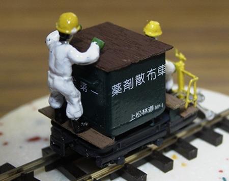 2001/09/18 森川様 こんばんは いろいろと手がけていた工作品の内、まずは、薬品散布車が完成しました。 6月26日付メールより「薬品散布車の図面を描いてみました。送信していただいた写真とは異なる方のものですが。私の写した写真を見ると、タンクの容量は2立(2000リットル)のようです。1/87でW:14 D:17 H:13mmとなりました。片側にはハンドブレーキも付いていましたので、そのへんも自作する必要がありそうです。作業員はエコーの保線区員が使用できそうです。薬品散布をいかに表現するか?」 その後いろいろ検討を重ね、タンク部分はプラ板で作り、残りは8月31日(金)の夜から9月2日の夜までに一気に組み立ててしまいました。現物合わせの為、何度も付けたり、はずしたりでかなりの時間を要しましたが、まずまずの結果を得られました。 タンク部分 プラ板と模型の船用の板材 車輌部分 モデルワーゲンの運材車のハンドブレーキと連結器部分、 乗工社のプラ製運材車、真鍮線0.3Φ、0.4Φ 1x1Lアングルなど 車輪 レイルロードの3.8mm車輪 電導部 PEMのラグ板、燐銅線0.5Φ ランプ 20年前の関水金属の室内灯セット、光ファイバー インレタ 乗工社 人形 エコー 木曾森林の写真の様に、作業者を多くは乗車できませんでしたが、前後のバランスをとって、2名乗車できました。また、散布ホースは手に持たせてありませんので、楽ちんな状態で乗車しています。本当は、マスクとゴーグルが必要なようですが。 薬剤散布はチラチラ点滅する光で表現しました。接触不良を利用しています。人形は足、尻に差した真鍮線で固定してあるだけです。カブースと共に郵送しますので、ご笑覧ください。 もりこー:こういう遊び心がある模型って楽しいですよね。しばらくは、当社の「滝越」の構内を散布してくれています。