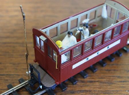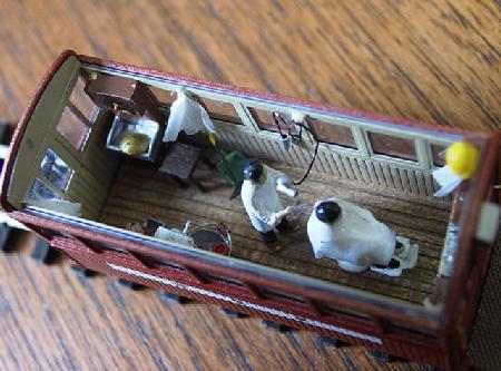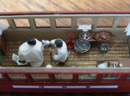 ![]() 2001/10/30 もりこー:高山の平田さんが最近出来上がった模型をまとめて送って下さいましたので、3回に分けて御紹介致します。 森川様 こんばんは。穂高町はいろいろと町内の行事がいそがしくたいへんですね。しかしこれが田舎(失礼)の良さと思いますが。各車両が完成しましたので、報告します。 @ 木曾の理髪車 組み立て説明書にかかれていた「誰か牧野さんの右手にドライヤーを持たせる人いませんかー?」この言葉に挑戦して理髪車を完成させました。 1.牧野さんの左手(右手にも持ち替え可能)にハンドドライヤー(コード付)を持たせ、 窓側に電気バリカン(窓上にコンセントとコード付)を下げました。 2.牧野さんのメガネ(顔にメガネを書き込む技術がなかったので、 スチーマー横の棚上にメガネが置かれている状態) 3.雨樋、縦樋をつけました。 4.木床としました。 5.車内色は説明書に従い、クリーム色二色で塗りました。 6.車内に備品を追加しました。カーテン、スチーマーの上のタオル、窓上の棚とヘルメット、 ポール形吸い殻入れ、いす、一斗缶のゴミ箱、チリトリ、箒、アルミのバケツ、 流し台に置かれた洗面器、棚上にマッチ箱 7.台車手すりに縛り付けられた電気引込用の竹竿 小道具を作り過ぎ、車内が乱雑になってしまいましたが、笑っていただけるものと思います。
