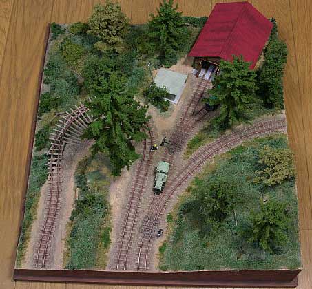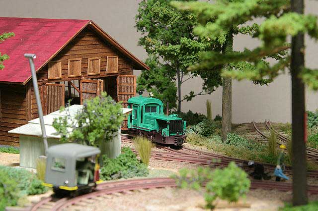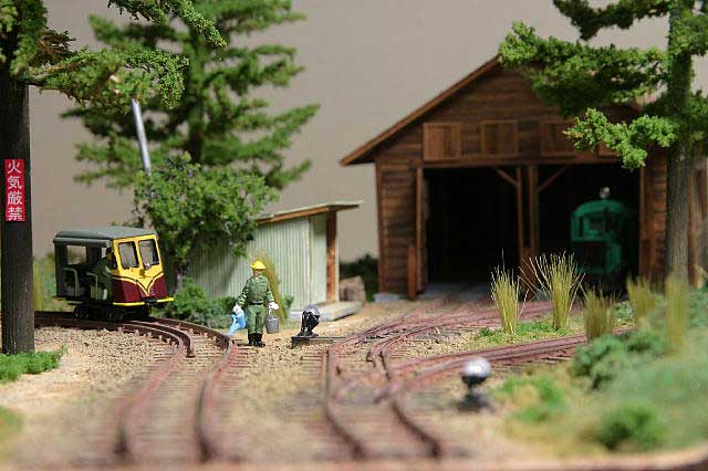 2004/05/05 森川様、今晩は。いつもお世話になります。以前お話した、ジオラマが完成しましたので写真を送ります。(細かいところは、後々少しづつ。)助六の駐泊所を作ってみました。いかがでしょうか? KMCの皆さんには、とても及びませんが自分なりに結構気に入ってます。雰囲気は出たかな〜と思います。一枚目の写真のシーンが作りたくて挑戦してみました。水撒きしているおじさんは、車載人形を使ってみました。如雨露とバケツは、自作しました。ちなみにポイント転換機も自作です。地面物も半田付けと違った楽しみがありますね。 PS:5月8日王滝村公民館に遊びに行く予定です。その際は、よろしくお願いします。 お久しぶりです。このジオラマ、イイ感じ出していますねえ。まさに「けむりプロのアルバムから」そのものですね。王滝村でお会いできるのを楽しみにしています。きっとKMCのメンバーも絶賛すると思いますヨ。(もりこー)