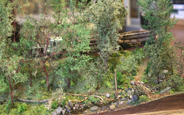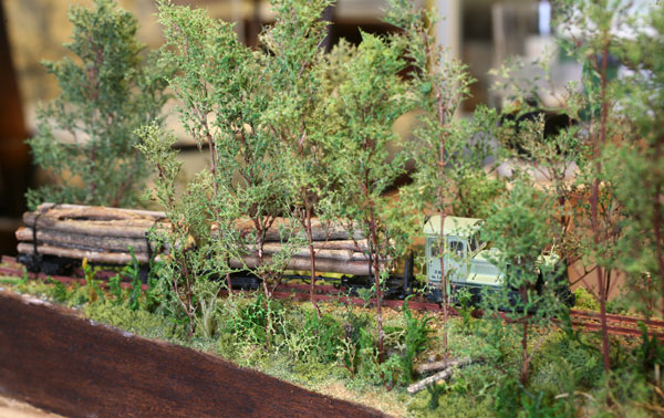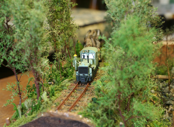 2006/08/27 北原さんは高遠の木材関係の方。ウチの記念品として皆さんにお配りしている「展示台」も北原さんにお世話になっているんです。実はむかし国鉄の機関手さんでEF58なんかも運転されていたとか。そんなことから今までは国鉄型中心に楽しんでおられましたが、ここ数年は林鉄模型の楽しさにはまってしまい、終業後の一杯の誘いもそこそこに模型工作に励んでおられます。 そんな北原さんが初めて作ったジオラマがこれです。思わず「初めて?ほんとに??」と聞いてしまいました。28x15cmの飾り台の上に作られた情景は、まさに2〜3級線の雰囲気満載で、とってもいい感じです。 樹木はエコーモデルのオランダフラワーを使われたそうですが、注目はその下に流れる「チョロチョロ川」。これが実に感じが出ています。聞けば、最近渓流釣りなどに行くと、ついついこういった情景に目が行ってしまい、「あーこんな感じを作れればなー」などと考えてしまうそうです。 ウチにある5tDLを添えて撮影をしましたが、2両の運材台車には細い枝を利用した材木が。本職だけに結構こだわっています!(もりこー) ![]() ![]() ![]() ![]() |