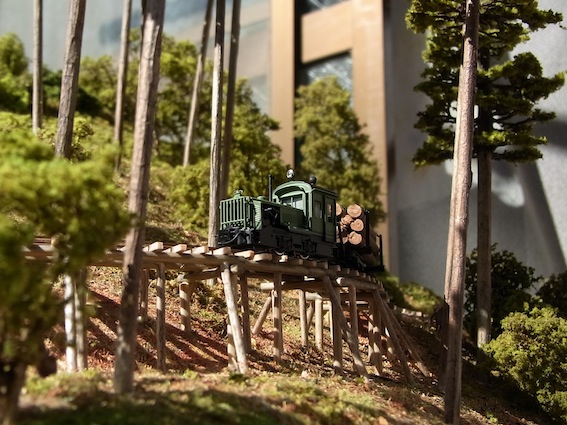 2010/02/26 森川様 こんにちは 熊田です。 先日の注文の時に書いたレイアウトですが、とりあえず写真を撮ってみたのでご笑覧下さい。 今は半分程緑化が終わった所で、父曰く「ここからが大変」とのこと。線路周りと木橋だけ私が作っています。桟道上軌道、涸れ沢等の「定番外なシーナリー」と「どこから見てもそれなりに様になる」が今回の一応のテーマです。 車両も、機関車以外にプラの運材台車もあるにはあるのですが、軽いために安定性に欠けるし、何より機関車に対して大きいので、早い所ワーゲン製を導入したい所です。 走行関係ではもう一点、今回は角材にコード40をスケールを当てながら接着したもので、お世辞にも精度が出ているとは言えないものですが、ワーゲンの機関車はこれでもスムーズに走ってくれます。おそらく3点支持構造がいいのかなぁと思います(昔のものは持っていないので、どの位の差があるのかは判りませんが……)。 レイアウトは、おそらく夏くらいまでには完成すると思うので、そのときはまたメールを送らせて頂こうと思っています。 熊田さんはお父様と協同でレイアウトを製作中とのこと。親子で同じ趣味を謳歌できるなんて素晴らしいと思いませんか?しかもその出来栄えは御覧の通り。完成が楽しみです!(もりこー)