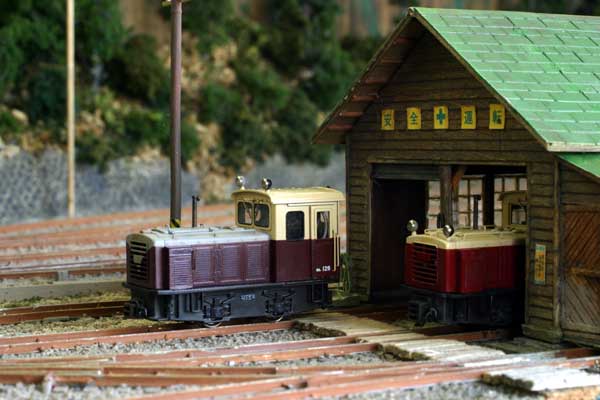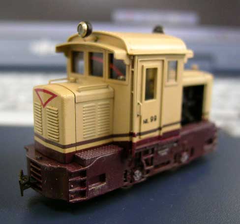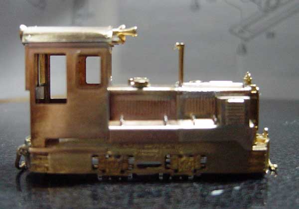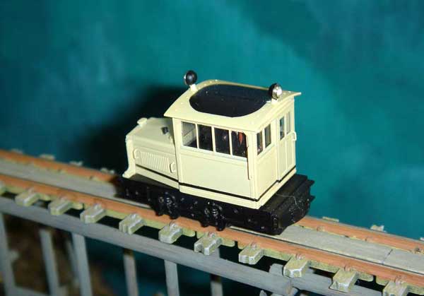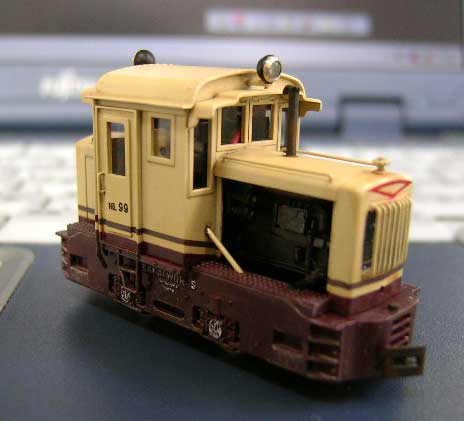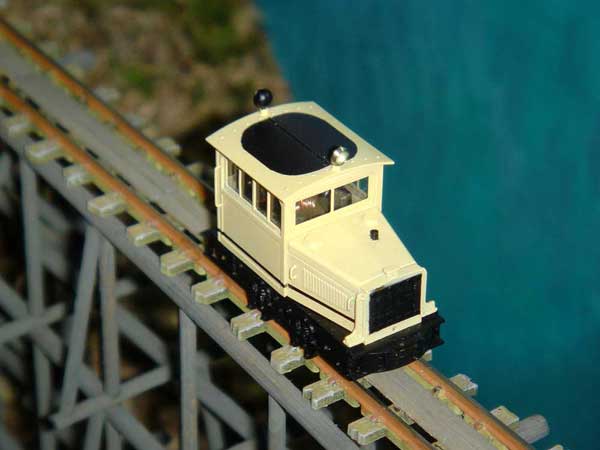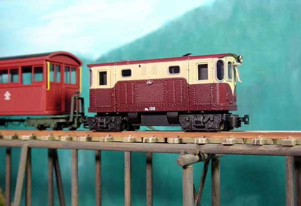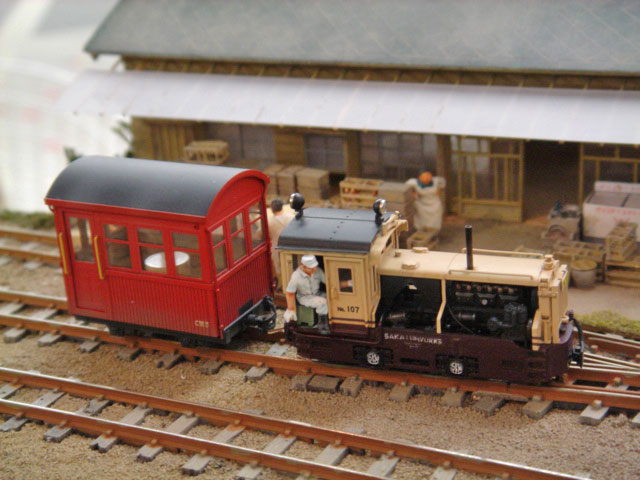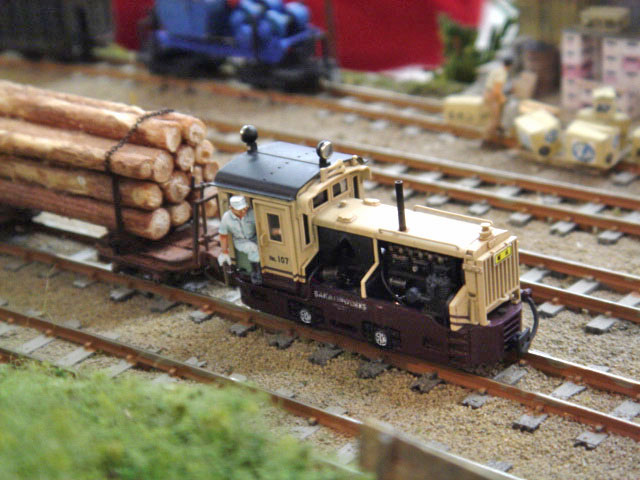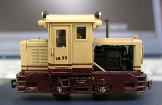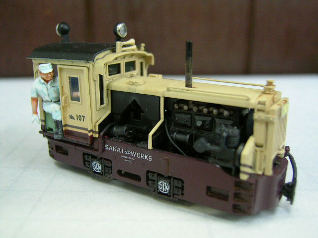2006/10/25 森川様 長期熟成を経て107番が完成しましたので御報告します。低く構えたキャブとのっぺりとして長く感じるボンネットが、古のスポーツカーみたいで格好良いです。 いつも通りドアを開けて、椅子を仕込み人形を載せました。キャブ内は小型モーターのお陰でスペースが有ります。載せた人形も切った貼ったせずに手足の曲げ角度を調整しただけで納まりました(服装は実写のカラー写真を参考に上下白で塗ってみました)。 デコーダーはM1を試行錯誤の末モーターの後に立てました。今回は、何故かアナログでは全く使えない状態になりましたが、DCCではバッチリ!自信有り!です。 台枠や軸箱の文字への色差しは栗島さんの定番になってしまいましたが(それ自体も凄いことなのですが)、排気管の色合いやキャブ内台枠の薄緑色の色差しなど、観察眼は素晴らしいものがありますね。きっと皆さんの参考になるでしょう。そして人形。「くりしま人形」の原形作者だけに、仕上げはバッチリですね!!(もりこー)
