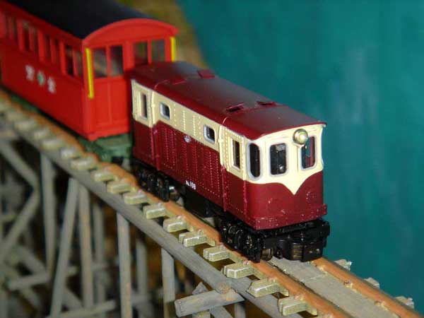 ![]() 2004/01/18 5tボギーです。少しでも早く完成させたい一心で作りました。したがって追加工作はなし。ただし、前面のHゴム窓(前後で8枚)はハメコミにしました。光が反射すると結構格好良いです。下回りは、柴草式に改造してありますので、R120位まで回れます。とにかくスローが凄く良くきく車両です。 B客との大きさの対比。これがイイんですよね。(もりこー)