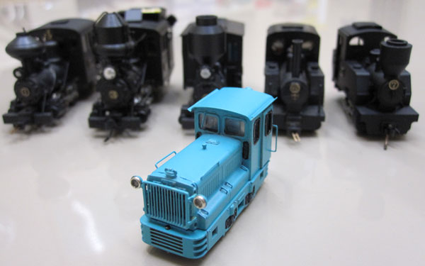 2010/02/24 もりこー様 秋田の南浦です。 年末セールで購入した「大畑の協三4.8tDL」が出来上がりましたので、恥ずかしい出来ではありますが写真を添付いたします。 これまでは瞬間接着剤でごまかしていた、ボンネットの取っ手などの細かいパーツの半田付けに初挑戦しました。つまんでいたピンセットの先から飛んで行って2日後にやっと見つかったパーツもあり、その間「掃除をするな」と言ったものですから、妻からのプレッシャーも結構なものでした。 クリスマス前には組立てと好みの色での塗装が終わり、試運転でも3点支持が効いて滑らかにスローで動きました。 最後の壁になったのがHゴムの塗装でした。筆塗りは苦手で中々同じ幅の線が引けず、拭き取ってやり直すうちに下地が出たり、落っことして雨樋を歪めたりしてしまいました。 また、この時点で前妻板の窓枠を裏返しに着けていたことに気付きましたが、修正とHゴムの塗装は断念しました(ガックリきて1カ月お蔵入りしました)。今日、窓ガラスを入れ、軽く墨入れをして完成ということにしました。 蒸気機関車ばかり(男だらけ?)の家のメンバーに、可愛いキュートな女性が登場した感じです。良くできたモデルで、作ることを十分楽しませていただきました。 なかなか素晴らしく仕上がったじゃないですか!色合いといい、軽く施したウェザリングといい、イイ感じです(^^♪。確かに仰る通り、野郎どもの中に紛れ込んだオシャレな女性って感じですね(^O^)。(もりこー)