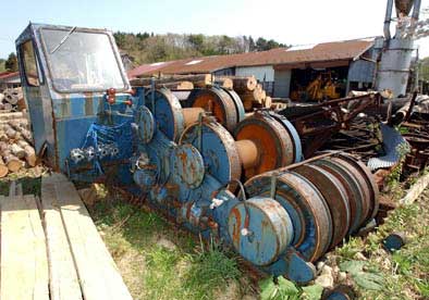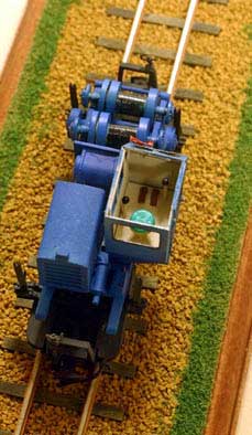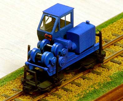 2003/05/16 森川様、集材機が形になりました。GWの5月3日、仕事で行った青森県でたまたま見かけた青塗装の「森藤」。仕事そっちのけで資料写真を撮り、翌日から製作に取り掛かりました。見たときは製品と同型かとも思いましたが、ドラムの位置など微妙に違っている様ですが、その辺は目をつぶりました。 キャブ右後方の小窓を開け、ドアーを前開きに変更。ワイパーをエコー製に替え、正面にやまばと号DLの二連タイフォンを赤く塗装しポイントとしました。キャブ内をアイボリー塗装にして、せっかくのインテリアなので椅子・ペダルに色を差しました。床板を半田付けしてしまったので色差しをするのに苦労したのですが、最初に塗装してから床板は接着にしたほうが楽だったと思います。撮影のため今は屋根も窓ガラスもついていませんが、次の休みにはそこまで仕上げ、ゴンドラに集材セットやワイヤー束などを乗せて、集材機運搬編成を組めれば面白いと思っています。ところで集材セットは青森の製材所にあったものは放置状態で錆び色でしたが、現役では黒光りで艶あり黒でいいのでしょうか。 梅雨入り前に未塗装仕掛品を一気に片付けてしまおうと、慌てて塗装したので仕上がりが雑になってしまいましたが、雰囲気はプロトタイプに近づいたのではないかと悦に行っております。私が見かけたように、林業が盛んな地域ではまだまだ集材機のプロトタイプが残っていそうです。皆さんも探して見られてはいかがですか。 簡単に組み立てられるからか、皆さん集材機は早いですね。赤いタイフォンが効いています。滑車の類の色ですが、僕が今まで見たものはみな黄色に塗られていましたが、どうなのでしょうか?(もりこー)