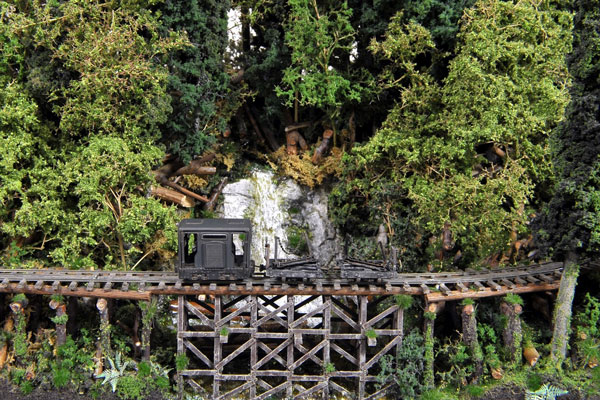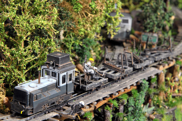2016/02/14 森川様、こんにちは奥谷です、いつもお世話になっております。 冬になり、我が家の林鉄にも仲間を増やそうと、以前導入した木曾の酒井製ロータリーDLの兄弟機として、簡易軌道の泰和製ロータリーDLを少々改造して組み立て、小ぢんまりと愛嬌のある林鉄仕様の姿にしてしまおうと思いました。 そこで(忠実に作られている方々からご批判を頂きそうですが...)思い切ってボンネットとシャーシを切断してショート丈の泰和製ロータリーDLにしてしまいました(^◇^;) 当初、下まわりの狭い隙間にキット付属の従輪を組み込みましたが、テスト走行中に脱輪するトラブルが多く(動輪とのスペースが狭すぎでした)残念ながら従輪は取り外し、代わりにエアータンクなどを装備してその隙間を埋めました(いずれ良い策が見つかれば木曾のロータリーDLのように従輪を組み込みたいと思います)。 この改造したロータリーDLは単独で十分に安定走行しますが、我が家では木曾のロータリーDLの兄弟機という設定であり、構造も真似て除雪時はキャブフォワードなどの力を借りて重連での運用とします。 木曾のロータリーDLと同様に、このロータリー?も5〜6tあたりを想定して小さくしてみました。無謀にもこのキャブフォワードも以前にミニタイプに改造したものです。 キャブフォワード・ミニとの重連走行や、ロータリーだけの単独走行も可能です。 独特のセンスで楽しんでおられる様子が好ましいですね*\(^o^)/*。クルクルの違いが面白いですし、ショーティーになった姿は見慣れないだけに、何だかとても新鮮だったりします(^v^)。こんなに短くして、重量のバランスが取れないんじゃないか心配したのですが、こう見えても意外にバランスがとれてて、オモリの位置や量を加減してテスト走行を何度も繰り返されたそうです。ボクの「何だかチョロQみたいで可愛いですね」というコメントに、「チョロQやBトレなんかは全く意識してないのですが、私は森林鉄道の支線や作業軌道の雰囲気が好きで、家では本線などを走る大きなDLの出番が無いために、なんとか小型のかわいいカタチに改造して活躍できないものかと思ったことがきっかけです」とのことでした。カラーリングも奥谷色で統一されていて、好ましいです(^^♪。(もりこー) ![]() ![]() ![]() 2015/11/08 森川様、こんにちは。奥谷です、お世話になります。 先日、水タンクのパーツを分けて頂き、なんとか取り付け完成しましたので写真を撮ってみましたので、ご笑覧下さい(申し訳ないのですが、機関車は他社製品です)。 「変なパーツばかり分けて欲しいと言ってくるなぁ。」と不審に思われていることでしょう。このようなことになっております(^^;;; あと協三製特殊軽量機関車も完成しましたので一緒に撮影してみました。走行もすこぶる軽快です。 写真のレイアウトは昨年TMSレイアウトコンペで入賞した(といっても準佳作ですが...)朽木谷軌道のレイアウトを使用して撮影しました。 レイアウトの詳細はTMS No.877 2015年4月号に記事として掲載して頂きましたので、ご覧頂いた方もおられるかもしれません(レイアウトはその後、低木や草、鹿を数頭など追加して少し手直しをしています)。 このDLは、その時の応募に間に合うように急いで一旦完成させたのですが、あまりに納得がいかない仕上がりだったため、どうせならと思い、今回、モデルワーゲンさんに無理を言って分けて頂いた水タンクを屋根上に追加し、当軌道のカラーで再塗装したものです。 協三製特殊軽量機関車はこのレイアウト用ではないのですが、一緒に完成させ?ましたので、このレイアウトで撮影してみました。モデルワーゲンさんからもう1〜2年早く製品化して欲しかった機関車です。 素晴らしい新人の登場です!(^^)! 一番下の木製運材台車を見て頂ければアップ気味ですから理解できると思いますが、ボクがまず最初に参ったのは、鉄の部分と木の部分の質感の違いです。鉄の部分にはチャンと錆びを効かせてあり、木の部分には朽ちた感じが再現されている点です。奥谷さんは愛知県で手作りのパン屋さんを経営されているだけに、絵的センスがおありなのだと思います。レイアウトの工作にもその一端が覗かれているように感じるのですが・・・。DLのモディファイの楽しさもさることながら、カラーリングもイイですよね*\(^o^)/*。(もりこー) ![]() ![]() ![]() ![]() |