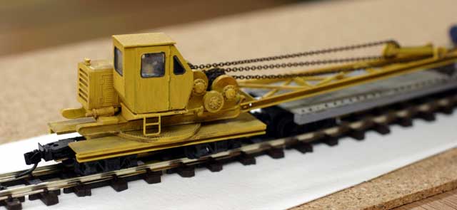 2003/12/27 もりこーさん、運転会では色々とお世話になり有難うございました。先日の「モデルワーゲンの車輪規格」は目からウロコと言うか、日頃いかにメーカーを盲信しているか驚きました。 さて、クレーン車の原稿です モデルワーゲンの森藤式大型集材機を購入しました。完成度が高く問題なく組み立てることが出来たのですが、大阪での単身生活で時間がありましたので、クレーン車への改造を試みました。 ブーム部分はアメリカ製のシャープなアングル、チャンネル材から木曽路日記で紹介されている協三のクレーンの写真を参考に組み上げました。 プーリーはエコーのハンドブレーキホイール(1630)を使い、鎖をそれらしく張ってみました。台車は珊瑚模型の小型アーチーバーにケーディーを装着しています。 塗装はスプレーの黄色、十分に乾燥させた後にハンブロールのNo.29を希釈して埃を表現してみました。運転席にはプライザーの人形がいつでも作業ができるように座っています。 木製のフラットカーとペアで当鉄道のカーブ(200R)を無事通過してくれ、まずはホットしています。ワーゲンでクレーン車が製品化されるのを待っているファンは大勢いると思いますよ!!!! KMCの会員たちも、このアイデアには脱帽していました。こういった柔軟な発想って楽しいですよネ。(もりこー)