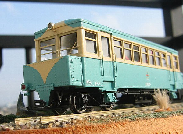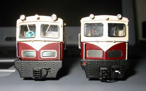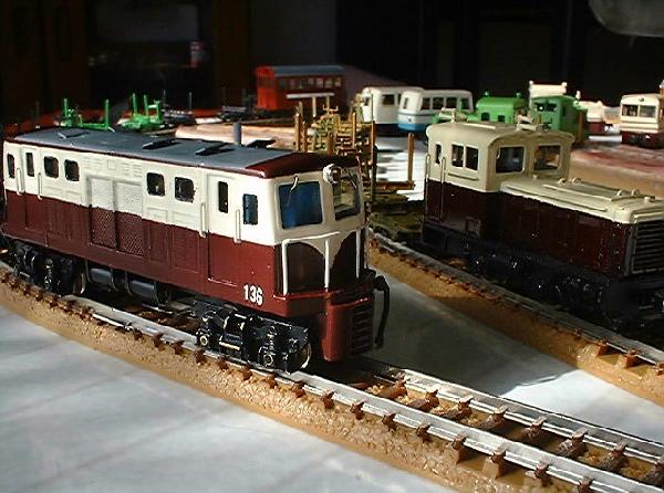 ![]() 2005/12/07 森川様 ご無沙汰しております。 軽便祭以降、それに伴う仕事のしわ寄せなんかで、殆ど模型に手を付けられませんでした。ボハフ、シボフのインパクトは凄まじくてすぐにでも手を付けたかったのですが、サハが未完だったもので、これを仕上げてからと思っていました。 しかし、このサハですが、完成すると凄い存在感ですね。ガソの添え物って感じでいたのですが(失礼)一輌で見た場合、ガソよりも味わいがあるような気がします。 模型って、実物がかっこ良かったり、人気があったりしてそれを身近にして満足するっていうのが多いと思うのですが、このサハは、実物がどうこうというより模型としての主張がありますね。実物は実際に見たことはないし、あまり気になる車両じゃなかったので、実車に似ているかどうかはなんともいえないのですが、そんなことは関係なく、模型として素晴らしいものだと思います。写真じゃ分かりませんね。また、つり革、座席など、すべてを付けて初めて輝くといった感じでした。 明日(もう今日ですが)からはボハフにかかります。完成が楽しみです。極力半田を隠して、クリアー仕上げなんてのも有りかななんて考えています。 もりこー:過分なお褒めの言葉を頂き有難うございます。山椒は小粒でピリリ、といった感じをイメージして設計しただけに、それが判って頂けて嬉しいです。 ![]() 2005/09/04 森川様 こんばんは、DC12が完成しました。 この質感、というか重量感、とてもHOeの機関車とは思えませんね。この機関車については中部さんがインプレッションを書いているので、それ以外で感じたことをいくつか・・・ 上まわりについては、特に問題なく組めましたが、フロントのヘッドライトと手すりの取り付けは、やはり穴を開けて裏側から半田を流したほうが安心できると思います。ただし、ロストに穴を開けるのは気をつけないとドリルが食い込んだり折れてしまったりしやすいので要注意ですが。あと一つ、キャブ前面のヒサシです。説明書どおりの付け方ですと多少角度が深いような気がします。実車を確認されたそうなのですが、あえて少し上向きに付けてみました。 下回りは、ロッドの調整はしっかりする必要がありました。エアータンクを薄くするのは勿論ですが、私の場合はブレーキシューがロッドに干渉していました。引っ掛かりがあったら、どこの部分なのかを十分にチェックしてから対応しないと変なところを削ってしまう可能性ありです。この辺はギヤー駆動とはいえ、蒸機のロッド調整を思い出してしまいました。それから、追加された説明書に書いてあったカーブ対応の加工は、ぜひやるべきだと思います。動きが非常にスムーズになります(Bトレ用の100Rの通過も可能になりました。)。 塗装はスカ色の青に黒を混ぜて塗ってみました。どんなもんでしょうか。このような色の濃い機関車の場合、窓枠の白もそうですが、あちこちに入っている標記類がいいポイントになりますね。今回は、アルプスモデルの「沼尻」を使いましたが、これとナンバープレートが付くと一気に表情が出てくる感じです。あと、迷っているのは前後の警戒色です。塗ることによって魅力が増すか、下品になるか。じっくり悩みたいと思っています。 こうなってくると、セタやボハフなんかが待ち遠しいですね。 もりこー:早速柴草さんがレポートを送って下さいました。お書きになっておられるヒサシの角度ですが、磐梯に保存されている実車の角度を測りましたので、まず間違いはないと思いますが、恐らく実車の場合は、見る角度が下から見上げる場合が多いのに対して(写真撮影の場合も同じですから、残っている写真も同じですね)、模型の場合上から見下ろすケースが多いので、その違いではないでしょうか?EH10の正面窓の感じについても、同じような話を聞いたことがあります。細かいレタリングがいかに効果的か、がよく判りますネ。
