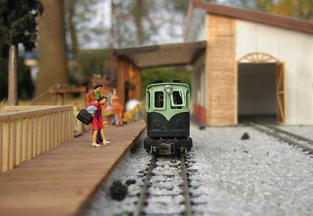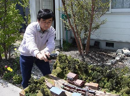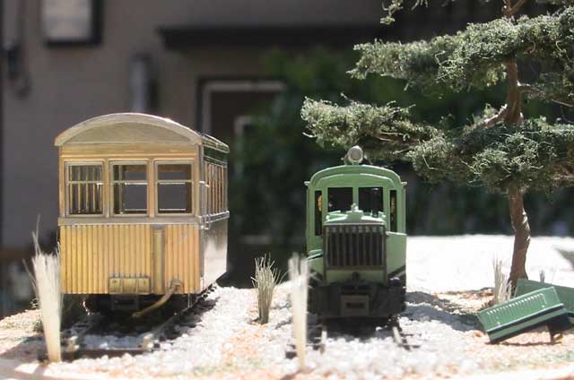 ![]() 2001/05/05 この春に熊本から転勤で東京に戻ってこられた柴草さんが、連休を利用して昨日当社に遊びに来られました。メールのやりとりで「ぜひ滝越のジオラマ上で写真を撮りましょうヨ」とお誘いしていたので、作品を御持参。天気も良かったので、外での撮影はとっても気持ちの良いものとなりました。モーターカーはプラ板から作った自作。「自走しなくてもイイから、こういった車輛も欲しいネ」と盛り上がりました。