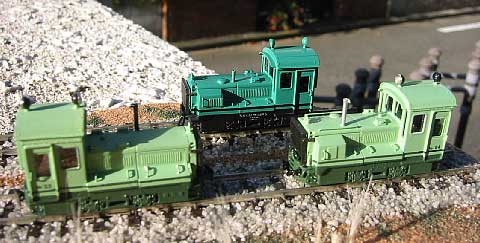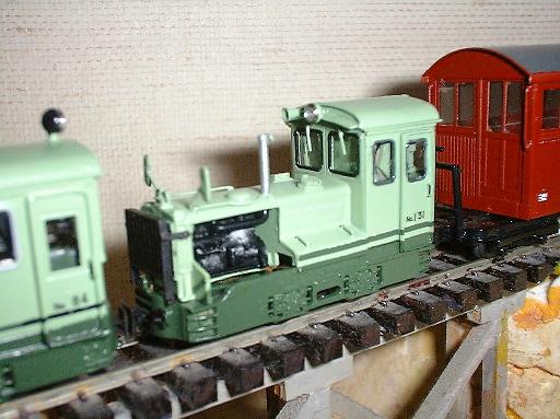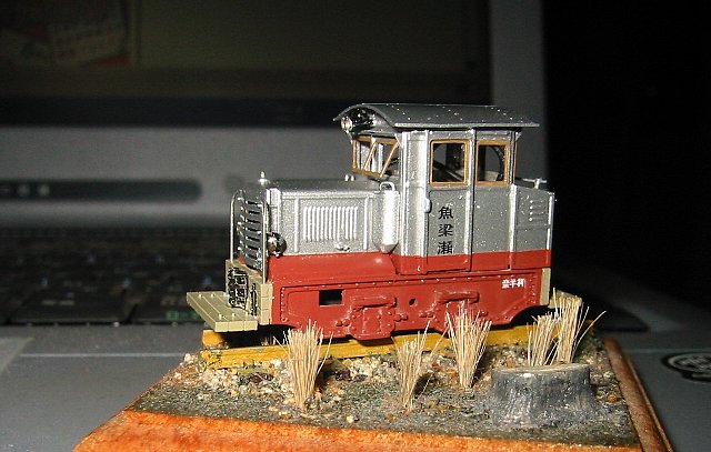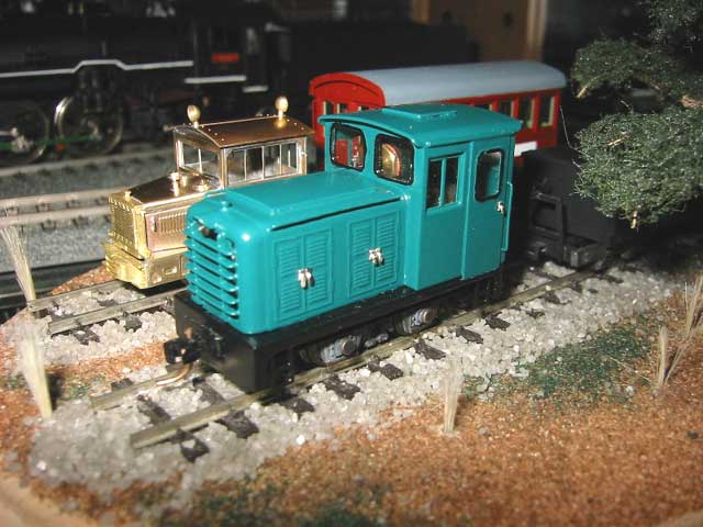 ![]() 2003/04/11 森川様 先週末は信州は雪だったようですね。東京も冷たい雨が結構強く降っていました。せっかくの土曜日だったのですが花見もできず、17番を作っていました。で、ご覧の通りです。今日はカラッと晴れたので、塗り直した90号機と並んで撮影です。 丸山渡の奥の情景をジオラマ風に作りたいので、つい組んでしまいました。まだモーターカーやホイットコムの2号機も手をつけていないのですが、どうしても気になっている模型は早く手がついてしまいますね。KMCモジュールの習作に地面、樹木を作ってみようと思いますが、あの色あせた色(紫、藤色?)は何色を塗ったら良いのでしょうか。 もりこー:上手い!早い!もうひとつは?でもエアーホースは、もう少しLの字に曲げた方が、台車が首を振った時にカプラーと干渉しないと思いますヨ。そうですか、丸山渡の情景を作るのですか・・・5月の第二回視察会ではジックリ観察しないといけませんね。あの褪せた色って、箸に付いたまま乾いたお汁粉みたいだと思いませんか?何色って、うー。 ![]() 2003/03/18 森川様 一応、90号とホイットコム、出来上がりましたが、天気があまりよくなくて、写真はうまく取れませんでした。 とりあえず、お送りいたしますが、もう少しまともなやつを後日お送りいたします。 もりこー:90号機はキャブ窓も大きく改造して、本格的ですねえ。ホイットコムのラジエター保護枠も追加して、なかなか個性的に仕上がっています。皆さんはどんな感じに仕上げていますか?