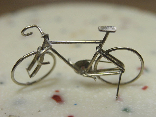 ![]() 2002/07/30 柴草さんから今回は郵便が届きました。開いてみたら・・・(もりこー) 森川様 暑い日が続いていますが、いかがお過ごしですか? いつもEメールと写真ばかりなので、今回は現物をお送りいたします。お忙しいところへの陣中見舞いです(お中元というには、ちょっと小さ過ぎるので)。ご笑納ください。 少しオーバースケールかもしれませんが、A型ゴンドラの積荷、または滝越のジオラマにでも置いていただければ幸いです。材質と構造が判るように、あえて未塗装にしてあります。お好きな色に塗ってくださっても結構です。 最近、半田付けと細工の練習を兼ねて、こんなものを作っては、友人たちに配っているのですが、量産が出来ません。モデルワーゲンでキットを作りませんか?(なんて冗談です) エコーの自転車も良いとは思いますが、ハンドル可動、ペダル回転は、当ファクトリーの専売特許と思っています(ただし、可動部分のパイプはエコーの細密パイプですが)。この他にも色々な形のものを作っていますが、サドルとチェーンケースを作るのに結構苦労をしています。プラ板で作れば良いのですが、変に全金属、全半田付けにこだわっているために、馬鹿みたいな苦労をしています。 蜜澤さんや昴鉄道の大羽さんたちの行動が羨ましいのですが、なかなかそちらにお邪魔することが出来ません。夏休みには何とかと思っています。 なかなかどうして。塗ってしまうのが勿体無いような出来栄えです。皆さんが見ている写真は、実物の約10倍ですよ。断然これは塗らずに飾り棚に飾らせて頂きます。松本民芸家具の飾り棚に置いてみたら、洋白の渋い光がとてもマッチしていました。(もりこー)