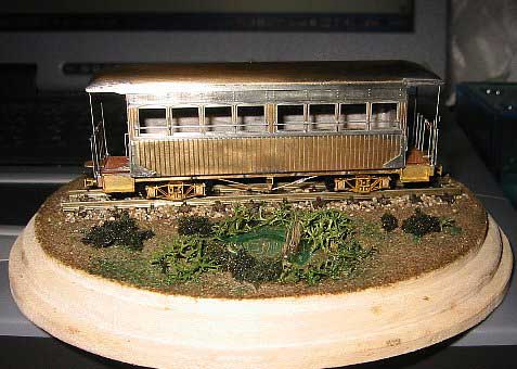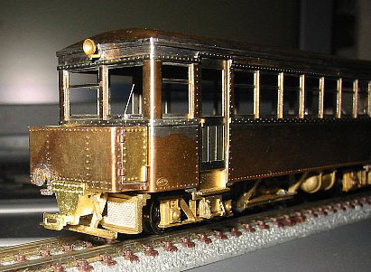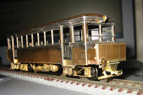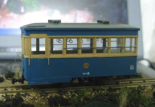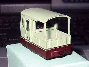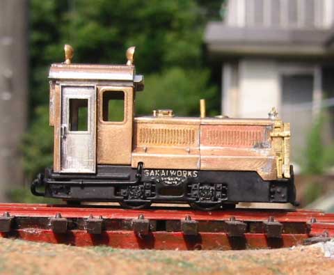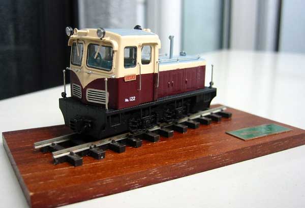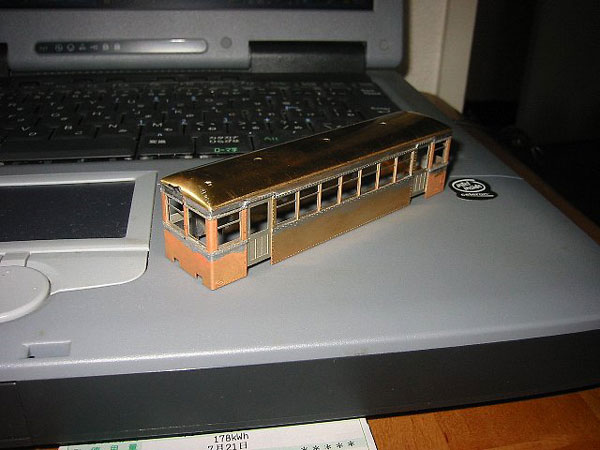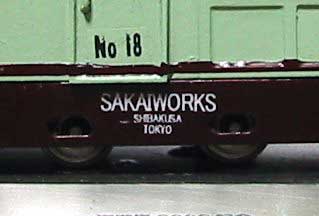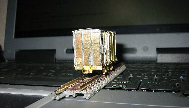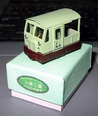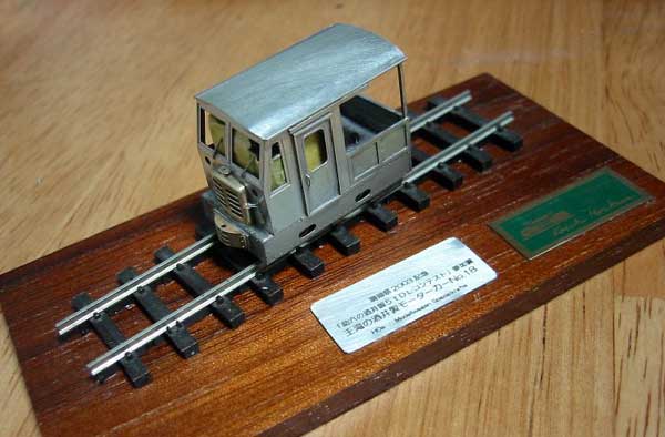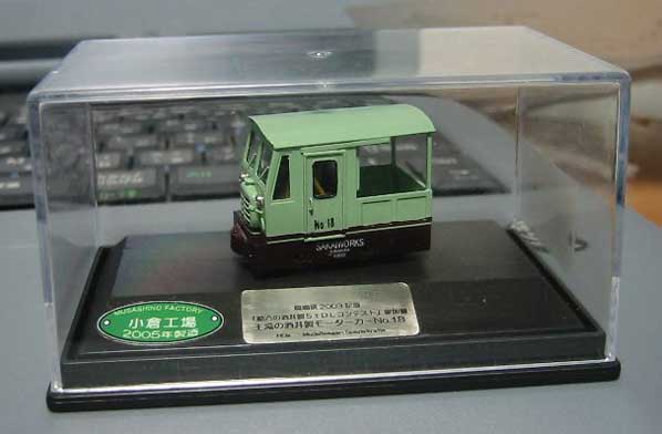 ![]() 2005/03/13 2/12 せっかく頂いたものですから、どうしてももう1輌作ってみたくなり、この連休で何とかしようと思っています。しかし、下回りだけとはいえ大変ですね。まだ、集電ブラシをどうしようか迷っています。 2/13 結局、この連休は18番で終りました。下回りもうまくいき来週は塗装できそうです。ウェイト仮止め用のテープが目立ちますが、きちんと塗装してこんな感じに飾ると結構いいですね。 2/17 色を塗りました。Hゴムもなにもまだですが、こんなことをして遊んでしまいました。このケース、正月に軽井沢のアウトレットで見つけたミニカーのものなんですが、いかがでしょうか?中身は72分の1くらいのミニでした。スケールはともかく出来はいいと思います。 この週末にはクリアーを吹いて、窓ガラスを入れて完成させるつもりです(特製デカールも考えています)。完成したら、またご報告いたします。 2/19 やっと完成しました。とりあえずこんな形で飾っておこうかと思います。下回りは実物とは違いますが、機関車のように「SAKAI WORKS」を入れてみました。本当は「SAKAIWORKS SHIBAURA TOKYO」ですが、「SAKAIWORKS SHIBAKUSA TOKYO」にしてあります。 実はこれをやってみたかったのです。酒井5tの浮き出し文字を削ってこれをやるのはあまりにもったいないし・・・ということで単なる自己満足ですが。 もりこー:まさに18番(オハコ)になった感がありますね、柴草さん。その度に新しいアイデアを盛り込んで。また、こうやってエッチングされていたプレートを付けてケースに飾ると、立派になります。