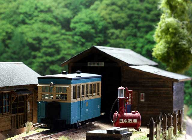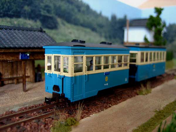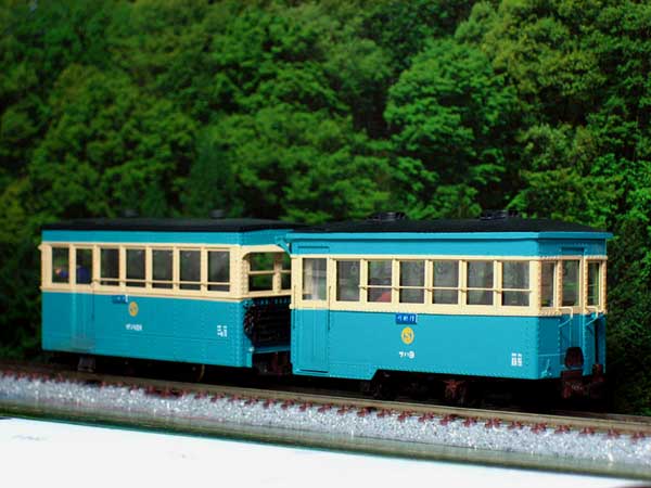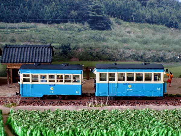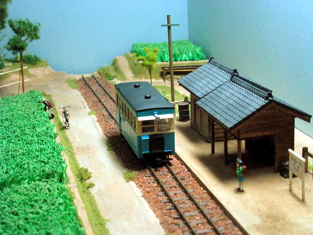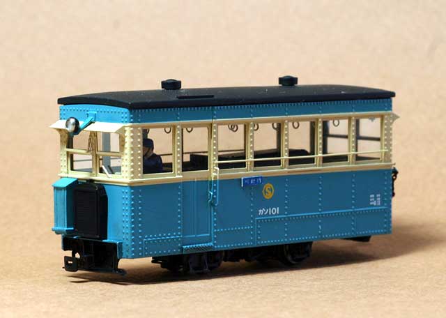 2005/05/08 森川様 植原です、こんにちは。 GW真っ只中ですが、森林鉄道フェスティバルでの準備でお忙しいでしょうか。 さて、沼尻のサハですが、本日完成いたしました。特に、組立ての難しい部分はなく、すっきりと完成させることができました。さすがに、良く出来たキットですね。プロトタイプはサハ9とし、ほとんど素組みです。 唯一、車内のシートを桧材で製作し直し、乗客も3人乗せてみました。カプラーは連結可能な朝顔形にしました。やはり、実感的ですね。ガソ101のパートナーができ、大満足の車両となりました。まずは、完成写真をお送りしますね。 ところで、連結可能な朝顔形カプラーですが、ワールド工芸のボサハ12にもつけてみたくなりました。沼尻用の朝顔形カプラーと段付きピンをお送りください。 もりこー:植原さんは「軽便モジュール倶楽部」の会員さん。下の2枚のカットの撮影台も御自作のモジュールの上で撮影されたようです。ただ単に、レールの上で撮影するよりも、イイ感じですよね。人形を乗せるとグッと実感的になってグー。