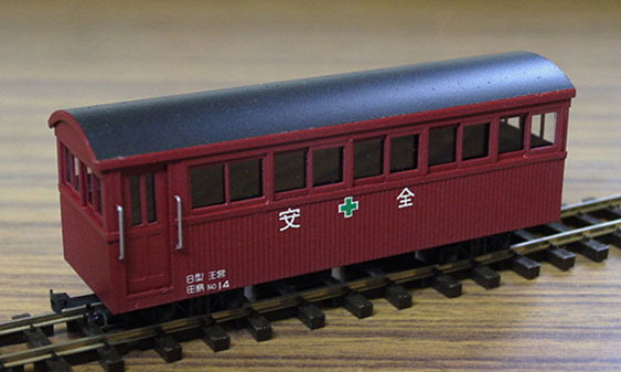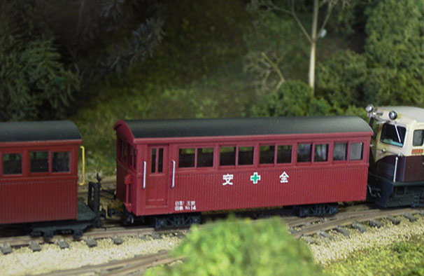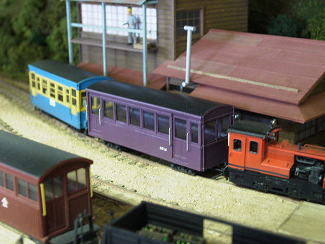 ![]() 2002/07/13 No.14 B型客車 もとネタは乗工社の丸瀬布客車。これもオーバースケールの高さを低くするために上下方向を切り詰めて、さらにKDカプラーの逃げ用の欠き取り部分を塞いだ。屋根は「当社のやまばと号」用(端板も)を2枚使用し、「やまばと号用客車」と繋いだ時に違和感が無いように(特に高さが揃うように)仕上げたもの。塗装はプラカラーの「交流電機用赤」に「インディーブルー」を混ぜたものだそうです。 こうして3輌見せられると、欲しくなってしまいますね。でも山下さんいわく「大変だよ」と。「ならば製品化しちゃおうかナ」と言ったところ、「頼むから暫くは作らないで下さいヨ。ようやくカタチにしたんだから」とさ。