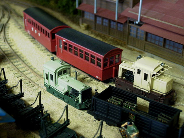 ![]() 2007/10/21 最近盛んに「木曽の酒井製5tボギーDL」のパーツを買っていかれると思っていたら、出来上がった新作を持参されました。これがやたらカッコイイ!ご本人曰く「どこかに居そうな雰囲気のフリーランスですから」と仰るものの、山崎営林署音水の34号機にどことなく似ている。それをボクが云ったら彼も「実はそうなんですけど、製品の側板をそのまま使ったので、点検扉の形なんかが微妙に違うんです」との弁。特徴ある正面はロスト製でワールド工芸のEF58用を、窓枠はウチの5tDL後期型のものを使ったそうな。なるほど。適度なウェザリングも効いて、なかなか雰囲気のある作品にまとめ上げる技量は流石でした。