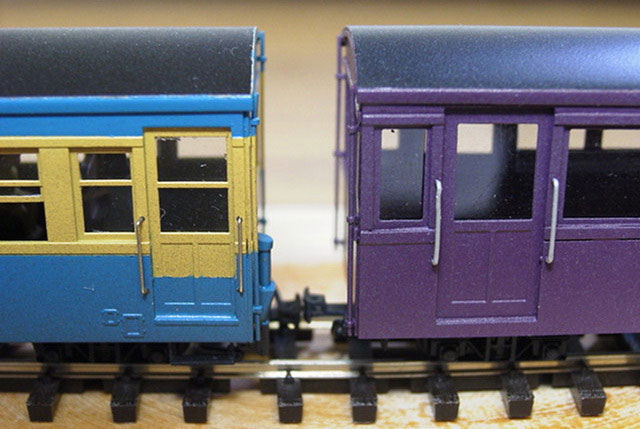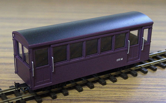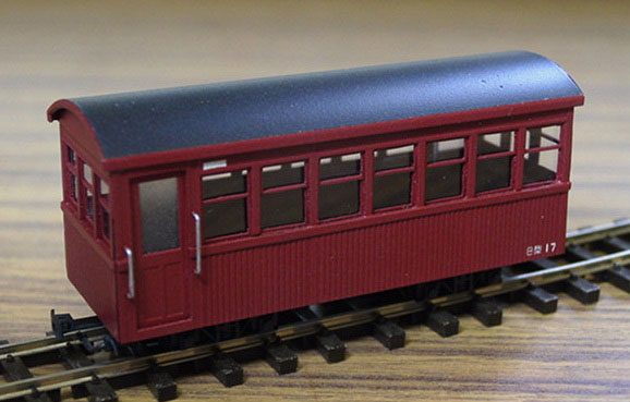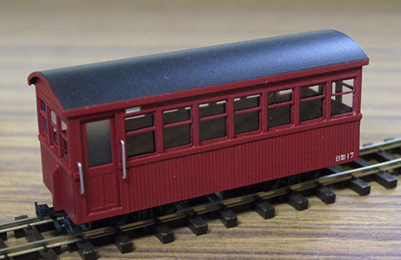 ![]() 2002/07/12 No.17 B型客車 もとネタは乗工社のC型客車(2段窓タイプ)を3輌分使って作りました。横方向と縦方向の切り継ぎ(窓も上下の寸法を詰めて、桟を新製)、屋根は当社の大型B型客車用(端板も)を、ドアーは乗工社のC型客車(2段窓タイプ)用を流用。これも戸袋窓の表現も怠ってはいません。