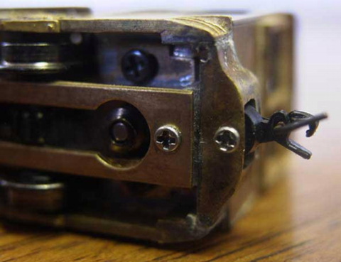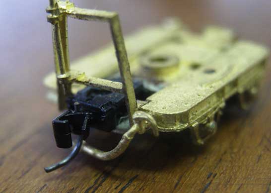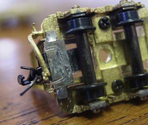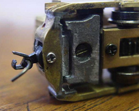 ![]() 2002/09/05 ここのところZゲージ用KDカプラー取り付けの研究をしておられる山下さんが、その途中経過を見せに来てくれました。Z用には数種類あって、N用のようなカプラーポケットに入ったものや、ポケットが無いものまであります。今回山下さんが使ってみたのは、5tDLにポケットの無いKD−902、運材台車にポケットの有るKD-905。 DLはエンドビームに4段あるカプラー穴の下2段を貫通させて、カプラーピンの入る穴に1mmのタップを切って止めてあります。またその後部コイルスプリング(半分に長さをカット)が入る丸穴を開けた1mm板を半田付けし、さらに0.3mm板でそのバネを押さえてあります。そのままではギヤーボックスの後部とは干渉するので、その角型スペーサーはネジ穴ギリギリまでヤスり込んであります。 一方、運材台車の方はポケットが入るように中央部をカットして組み込んでありますが、台車の上面よりも出っ張っていないので、客車などのデッキを貼る事も可能だし、貼ってしまえばポケットも目立たなくなります。