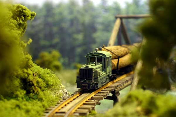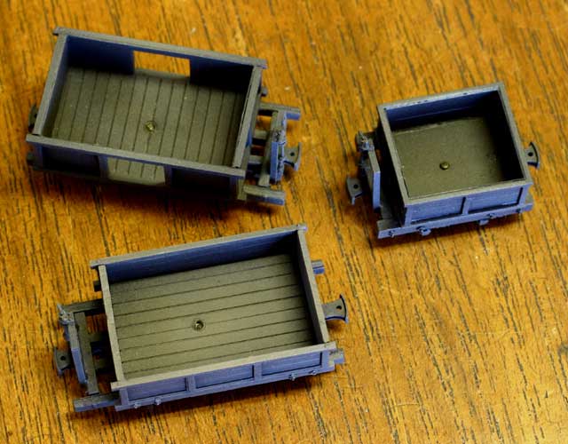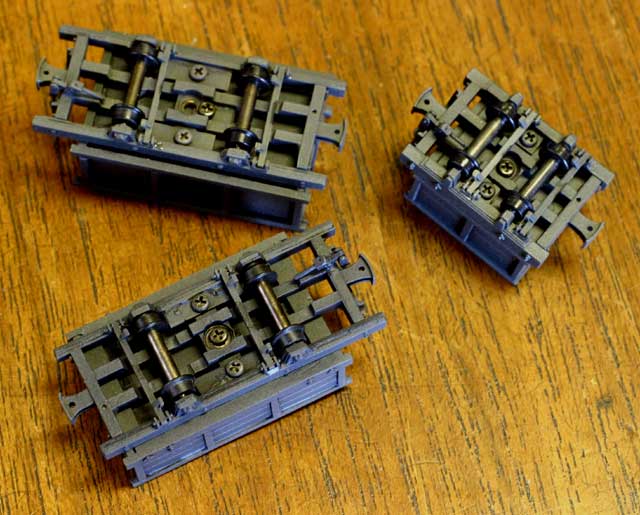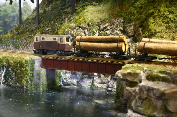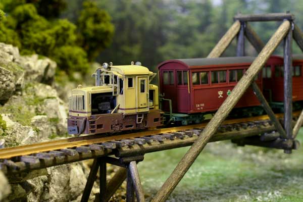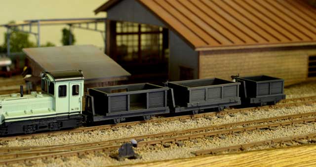 ![]() 2003/11/23 気がつけば一年以上も間が空いてしまいましたね。昨日山下さんが遊びに来られ、息抜きに軽い工作をしました、と言って見せてくれたのがこの2軸ゴンドラです。 大きい方の2両。側板に角穴が開いている方は乗工社のA型ゴンドラのを切り詰めて使用、開いていない方は当社のを切り詰めたそうです。台枠は乗工社の貴賓車のものに0.3mm真鍮板で裏打ちをして、当社の木製運材台車(Bタイプ)用軸受メタルをセットしたそうで、転がりは抜群でした。井桁の中枠は当社の木製運材台車用のを2個切り継いだそうです。確かに2軸のこのタイプは二つありますものね。 小さい方は自作の上まわりに、当社の木製運材台車(Bタイプ)を組み合わせたとのこと。こんな工作も楽しいものです。