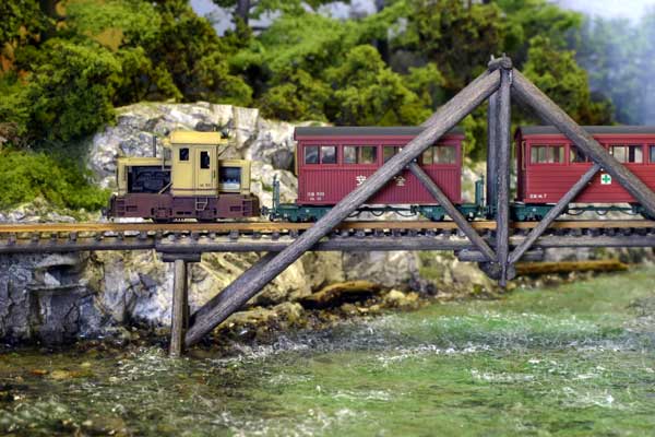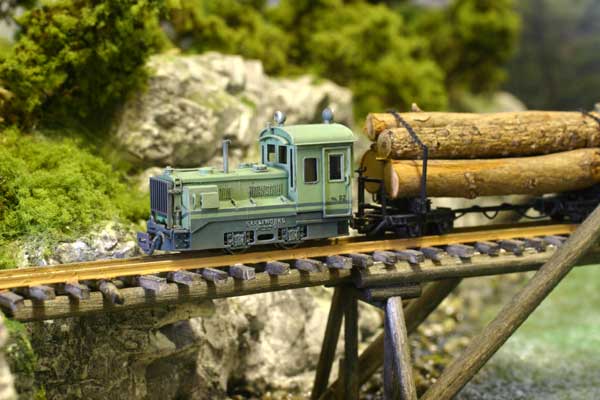 ![]() 2005/08/05 久々に山下さんが遊びに来られました。新作を持って。今回の新作は92号機と99号機。出来上がったばかりの「濁川」で初めてのお立ち台撮影となりました。 まずは92号機。これは皆様も御存知のようにワールド工芸の製品がベース。本人曰く「モデルワーゲンの95号機か何かをベースにして、ワールド工芸のサービスセンターでパーツを分けてもらった方が早くて安上がりだったかも」と言うように、台枠をはじめとして殆どのパーツは当社のものに交換しています。オリジナルの部分はボンネット側面とコンプレッサーカバー、キャブ側面とドアーのみだそうです。 塗装はプラカラーの「イスラエル空軍迷彩色」と「湘南グリーン」だそうです。これにきつ目のドライブラシでウェザリングしています。 続いては99号機。白眉は開放された後部ボンネット。乗工社製バッテリーと燃料タンク(パーツはエアータンクだったそうですが)を巧い具合に流用しています。エンジンは16番のエムテックス製DMH17Cディーゼルエンジン(DF-115トルクコンバーター付き)を切り継ぎして仕上たそうですが、「このエンジン、こないだ採寸してきたのよねエ。改良新製品に入れようと思って」のボクのひと言にガッビーン!!クリーム色はスカ線クリームに山吹色を混ぜたものと、阪急マルーンに茶色・白色を混ぜたものを塗ったそうです。その上から水性ウェザリングカラーでドライブラシ。なかなかメリハリがある仕上げは、女優さんのお化粧のようでした。