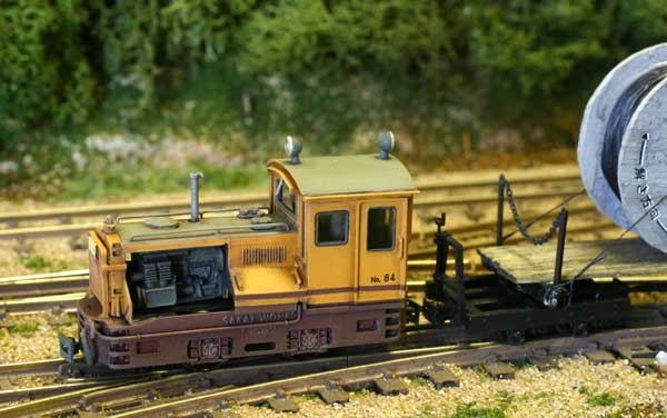 ![]() 2001/05/21 「山下さんのアルバムから」でお馴染みの山下さんが「王滝の33号機」の引き取りがてら遊びに来られました。ちょっとした小箱を持って。それは乗工社のワークカーを改造したものですが、動力装置には当社のナロー用を使用し、上まわりは大幅にスリム化を計り、よりスケールに近づけたもの。彼によると、製品は「軽便の譜」に掲載されている図面よりもかなり大きいそうで、ラジエター以外は殆ど新製したそうです。前後ヘッドライト・後部引き違い窓・カプラーは当社の部品を使用。ヘッドヘビーを防ぐために、屋根裏や台枠後部内には板ウエイトを貼ってありました。