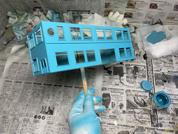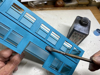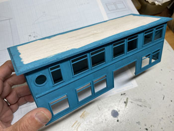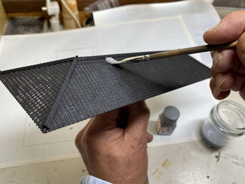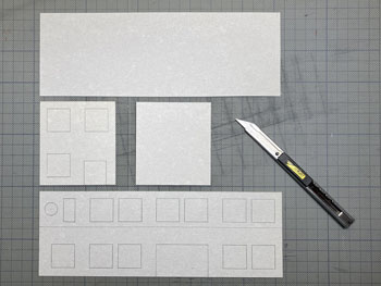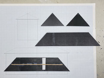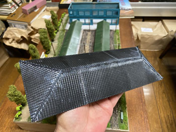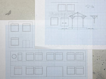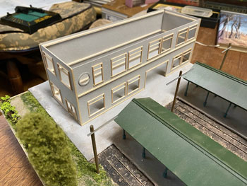 ![]() さて駅舎の製作です。 様々な写真を見て大体の感じは掴めたのですが、プラットホーム側の2階部分の窓配置はともかく、1階部分の窓配置は車両やプラットホームの屋根に隠れて殆ど見えません。 「見えないものは模型にしても見えないだろう」という楽観主義のボクは、それなりにデザインしてまとめました(^^♪。 駅舎の向こう側とあっち側(^O^)は写真には写らないので全くディテールは無しです(^_-)-☆。 入口になる「向こう側」は看板建築のようになっていて、瓦屋根は全く見えないのですが、今回はその部分は作りませんから関係なし。 まずプラットホームの屋根の高さ&勾配を設計したときの方眼紙に、写真から割り出した軒差しや窓の位置を描いて感じを見ながら位置決め。 そしてボール紙(いつも使ってるA4の方眼紙の台紙。適度にザラついていて1mmほどの厚みがありシッカリしています)にシャープペンでそれを書き込んで窓部分をカットしていきます。 ![]() 窓の周りには1mm角の桧棒を接着して、土台や角柱を1.5mm角の桧棒で接着。これを2mm角の桧棒で裏打ちしたものを突き合わせて箱状にしていきます。 試しにレイアウトの上に置いてみたのですが、存在感満点(*^^)v。この上に瓦屋根が乗るので、出来上がればもっと立派になるでしょう(^_-)。 ![]() そのあとプラットホームの柱と同様に「沼尻ブルー」に塗って、沼尻ブルーのラッカーが乾いたところで、別に作っておいた屋根下の部分も含めてフラットブラックで少し汚してトーンを抑えておきます。 ![]() そして瓦屋根の製作です。まず屋根の勾配(プラットホームの屋根と同じ)に合わせて図面を描き、そこから4面の寸法をはじき出します。 それをエコーモデル製のものにケガキ切り出すのですが、この製品の幅は45mmですので4mmほど継ぎ足す必要がありました。 ![]() 反らないように裏側には角棒を接着しておき、4面を貼り合わせます。 アクリル塗料のフラットブラックで塗ってから、エナメル塗料のライトグレーでウェザリング。 |