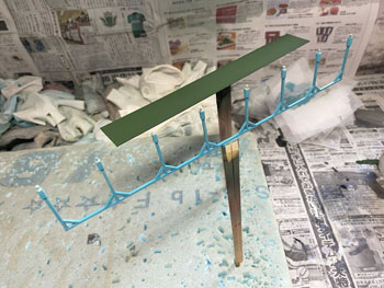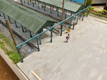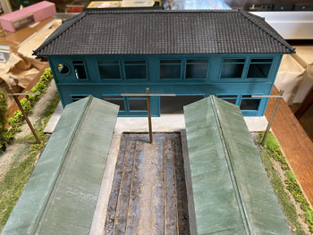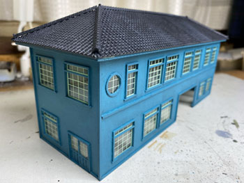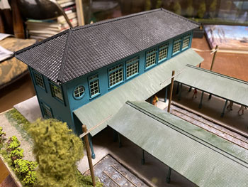 ![]() ![]() Facebookの或るお客様から、「軽井沢は浅間山の山麓にあるので火山灰が降り注ぎ、屋根も地面も灰色っぽくなっていると思います」という有難いアドバイスを頂戴したので、地面もプラットホームの屋根も薄く溶いたライトグレーでもう一度ウェザリングをし直しました。 モノクロ写真で見た、土にまみれた線路敷というのは実は火山灰でグチュグチュになっていた状態だったのですね。 これでかなりそれっぽくなってきました。感謝感謝です! そして瓦屋根を駅舎に接着して仮に置いてみましたが、やはり存在感満点の駅舎です(^_-)-☆。 ![]() エコーモデルに注文しておいた若草色の窓枠が届いたので、早速駅舎に貼り付けて完成。 あと残る作業は駅舎とプラットホームの間の通路の差し掛けです。 例によってボール紙に波板を貼り付けて屋根とし、柱はプラットホームの時と同じ方法で作りました。 ![]() ![]() これを湘南グリーンと沼尻ブルーに塗ってからウェザリング。これも同様の方法です。 土台にドリルで穴を明けて柱を固定してから、駅舎に付けておいたガイドラインに合わせて正確な勾配を確保しながら屋根を固定。 そして駅舎を土台に固定して完成です(*^^)v。 |