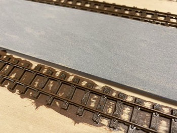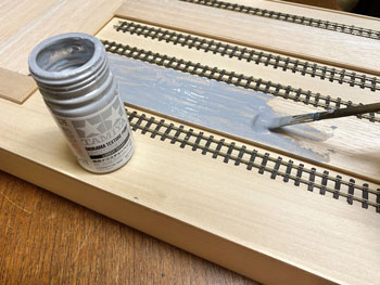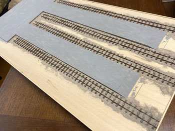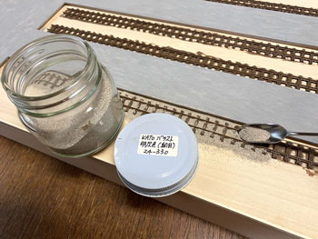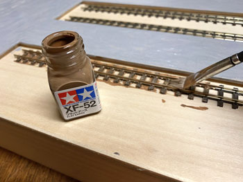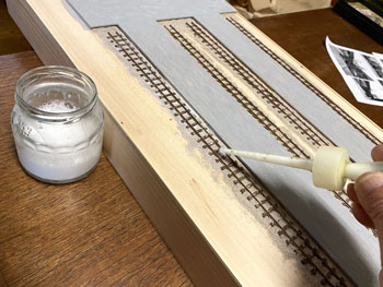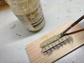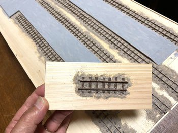 ![]() プラットホームや駅舎の土台となる部分には、タミヤの「テクスチャーペイント(ライトグレー)」を、枕木を含む線路にはダークアースを塗っておきました。 ![]() 朝起きてみたらそれらは完全に乾いていて、コンクリートの質感も良い感じ(^^♪。 次の段階として、線路の部分にバラストを撒いておきましたが、使用するものはいつもと同じNゲージ用のKATO製「明灰色(細目)」で、これまたワンパターンですが万力で潰して細くしたスプーンでこれを撒きながら筆で均します。 ![]() 木工ボンドの水溶液に僅かな中性洗剤を落としたものをスポイトで流しておきました。 ![]() 撒いたバラストも固まったようですが、実は試作品用に小さな板きれにも線路を打ち付けておき、それにもバラストを撒いておきました。 「バラストが土に埋もれているような状態」にするための試作品で、バラストの上にタミヤのテクスチャーペイントを塗り、乾燥後にそれをフラットアースで塗ったらどうか?と思ったからです。 ボクが高校生の頃(もう半世紀も前ですね)にはテクスチャーペイントなんていうものは当然なかったので、このような場合には石膏を流し込み、半乾きの状態で茶こしで石膏を振り掛けて面を粗にしたものでした。 |