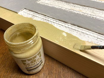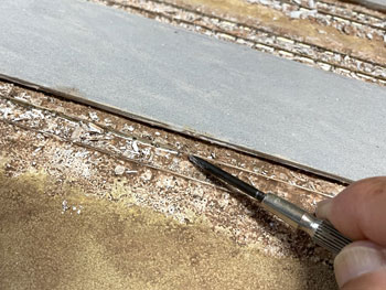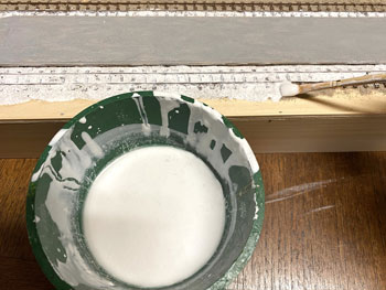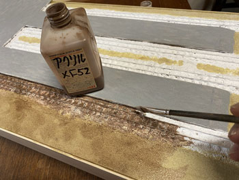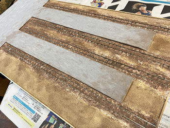 ![]() 試作で「これだ」という感触を得たので、本番に進みます。 まずバラストの上に薄く溶いた石膏を筆で塗っていきます。これで一面冬景色になりました(^O^)。 ![]() これが乾いたら地面にタミヤ製テクスチャーペイントを塗っていきます。 これが完全に乾くには翌朝にならないとダメです。 ![]() 次にフラットアースを全体にニュアンスを付けながら塗っていきます。 ここでレールの横に塗ってしまった石膏をマイナスの時計ドライバーで剥がしていきます。 いくら土に埋もれた枕木とはいえ、土砂災害に遭ったみたいなのは頂けませんから(^^ゞ。 ![]() そしてもう一度フラットアースを塗ってから、フラットブラックの溶液で塗り、ニュアンスをつけていきます。 ![]() これが一応出来上がった地面の全貌です。大坂なおみも応援してくれています(*^^)v。 |