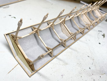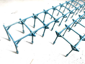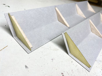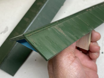 ![]() 次は屋根の製作です。 屋根の裏側に貼る角度ゲージを5mm厚バルサで作ったものを作りますが、こういった厚めのバルサを切るのにはカッターではなく糸ノコを使うと楽にしかも正確に切る事が出来ます。 ![]() 端面には波板が貼ってあるようですので、ゲージに貼り付けて、周りをカットしておきます。 屋根本体は1mm厚のボール紙を「ヘの字」に曲げておき、そこにさっき作ったバルサ板を貼ります。 ![]() 軒の部分と端の部分には1x2mmの桧角棒を貼り、仮に柱と組み合わせてみて具合を確かめます。 そしてエコーモデル製の波板を屋根に貼り(ちょうどい良い具合に屋根の幅と同じ)、最後に峰の部分に1mm角材を貼ってからその両脇にボール紙を貼って完成(*^^)v。 ![]() ここで屋根と柱は別々に塗装をしますが、カラー写真の少ない時代。果たしてどんな色だったのでしょうね〜(^O^)。 カラーと云えばヒギンスさんの写真集がありますが、彼は北軽井沢駅しか撮っていないのか、新軽井沢駅の写真はありません。 北軽井沢駅は屋根は鉛丹色、柱は木部色という色気のないもので、何だか物足りない感じ。 カラーが無いなら逆に自由な発想でも良い訳で、屋根は緑色に、柱はライトブルーに塗ってみました(^^♪。 ![]() まずプライマーを塗ってから屋根の端を沼尻ブルーに塗り、マスキングをして全体を湘南グリーンで塗りました。 完全に乾いてから、サビを表現するためにハンブロールの62番をシンナーで極く薄く溶いたものを筆に含ませてチョイと屋根に触れさせます。 そうすると屋根の凹みに沿って自然と垂れてきます。これを何度も繰り返して全体に。 この塗料は塗っている時はさほどでなくても乾くと結構目立ちますので、やり過ぎには要注意です。 ![]() 柱も沼尻ブルーに塗って、乾燥後にフラットブラックを極く薄く溶いたもので汚していきます。 左がブルーのまま、右が汚した状態です。 ![]() これらを合体させてプラットホームに置き、柱の位置をホームに印をして、φ1.5ドリルで穴を明けて差し込み接着。 とりあえずこれでプラットホームは出来上がりました(^^♪。 |